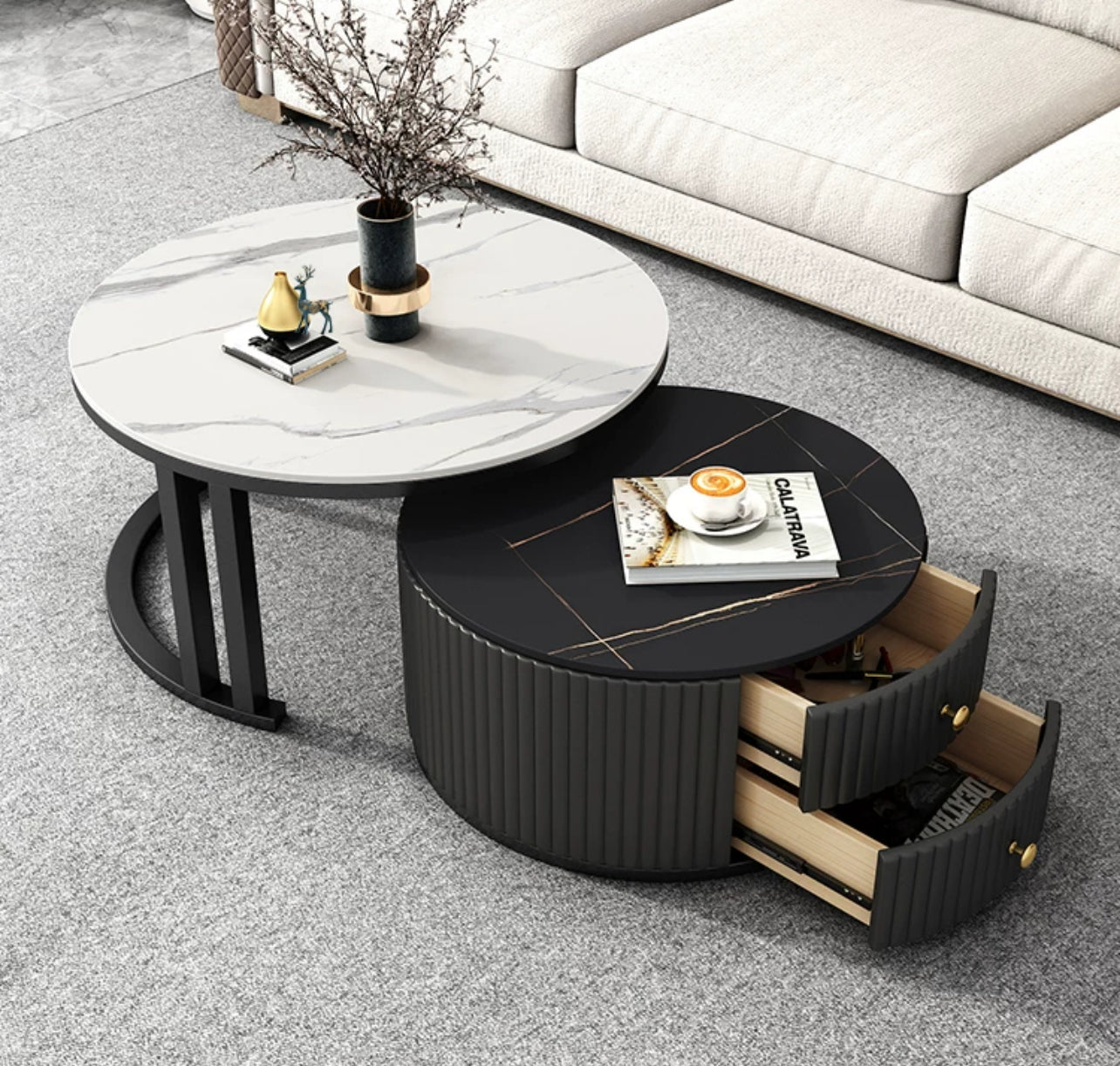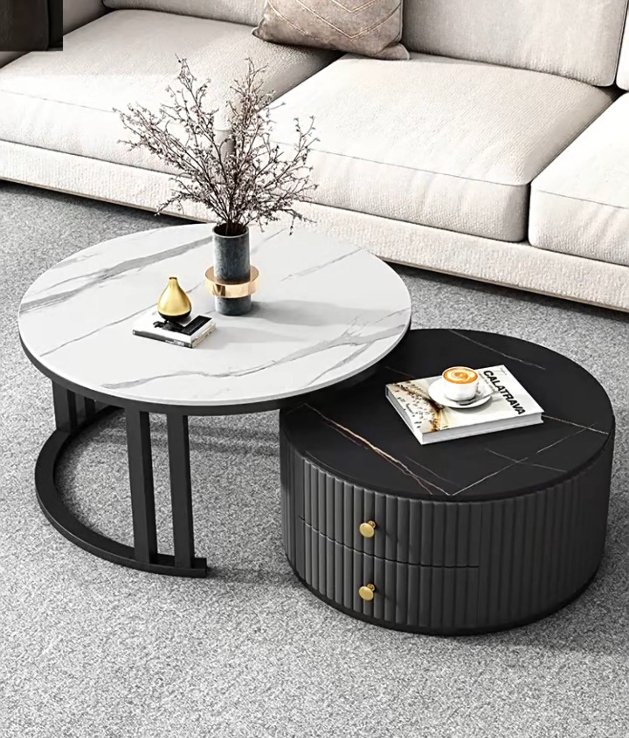 Introducing the Aurora Duo Coffee Table Set, a perfect blend of modern elegance and practical design. This striking set features two round tables that nest together seamlessly, providing both style and functionality for your living space.
