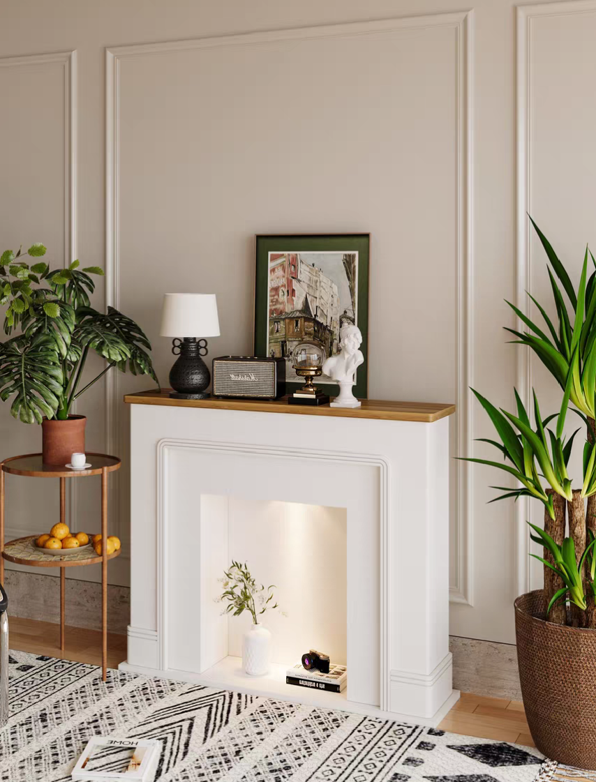 Enhance your home with the Aurora Faux Fireplace Mantel, a perfect blend of elegance and functionality. This beautifully crafted mantelpiece adds a luxurious focal point to any living space without the need for actual fire installation. Featuring a classic panel design, a warm LED-lit alcove, and a sleek wooden top, it offers a modern yet timeless aesthetic. Available in two sizes (100cm & 120cm) and a variety of sophisticated color options, this decorative mantel is perfect for displaying books, vases, candles, and personal decor.