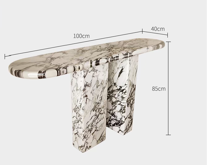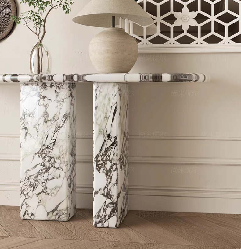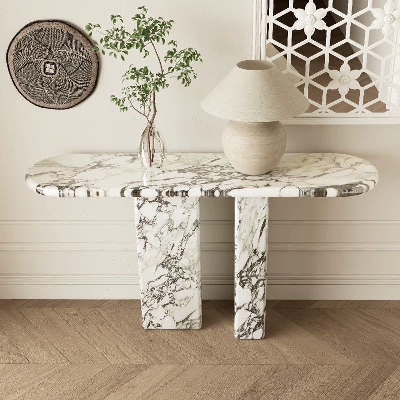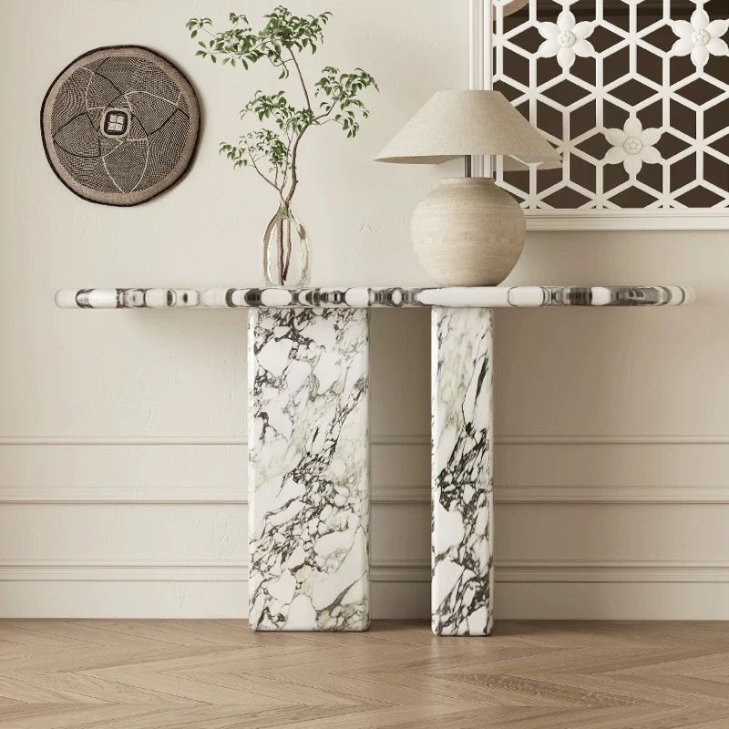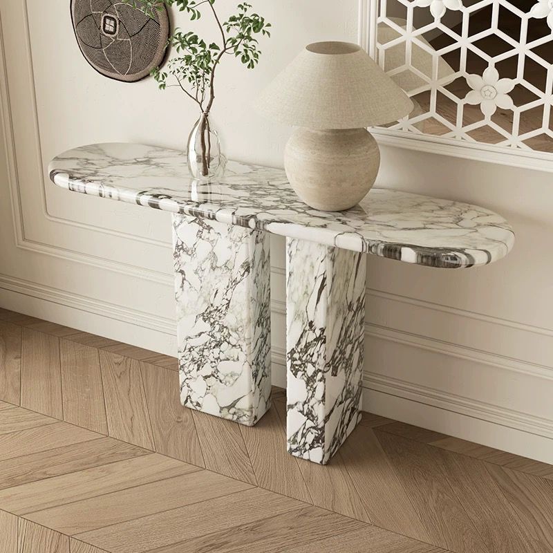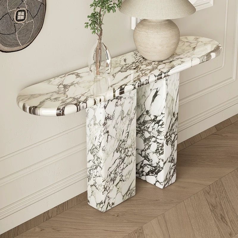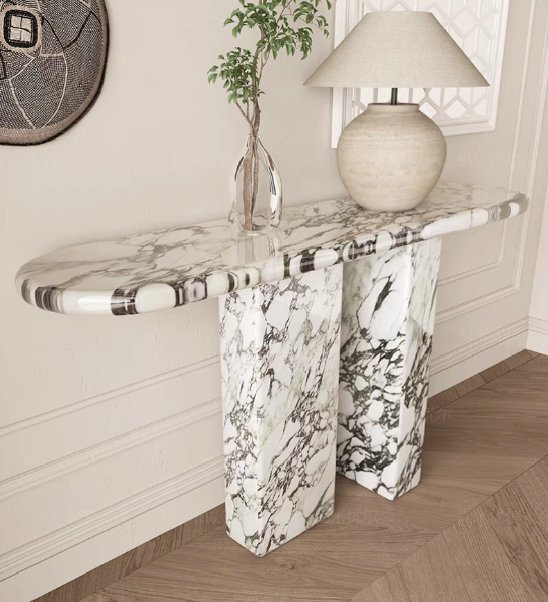 Elevate your home with the Aurora Luxe Console Table, a masterpiece of modern elegance and sophistication. Designed with high-quality marble, this statement piece features a bold yet refined asymmetrical base, complemented by a sleek, rounded-edge tabletop. Its exquisite veining pattern adds a touch of luxury and uniqueness, making it perfect for entryways, living rooms, or hallways.