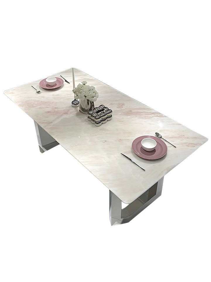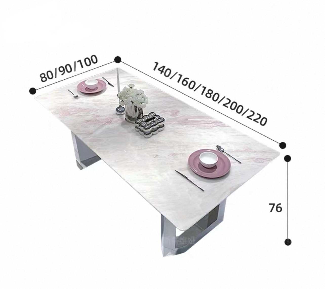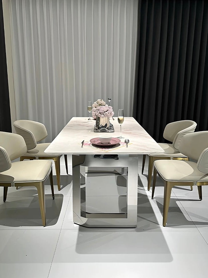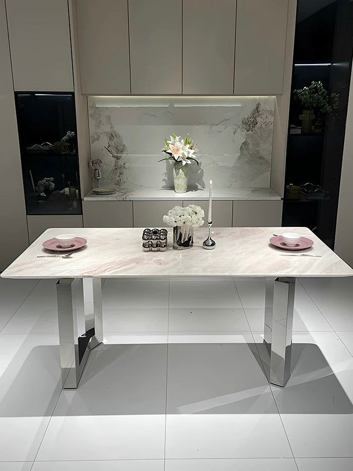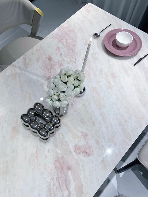 The Aurora Luxe Marble Dining Table combines contemporary elegance with premium craftsmanship. Designed with a smooth pink-white marble top and a polished stainless steel base, it is both durable and stylish, making it the ideal centrepiece for your dining room. The sleek finish is easy to clean and perfect for everyday meals or formal entertaining.
