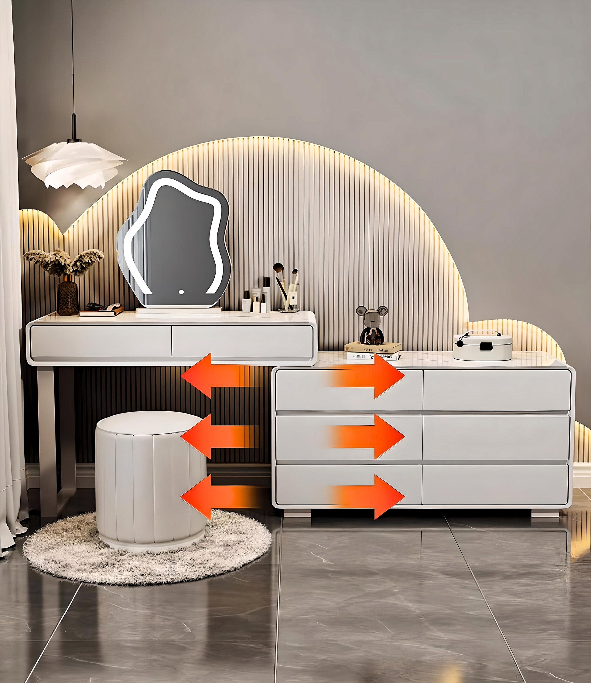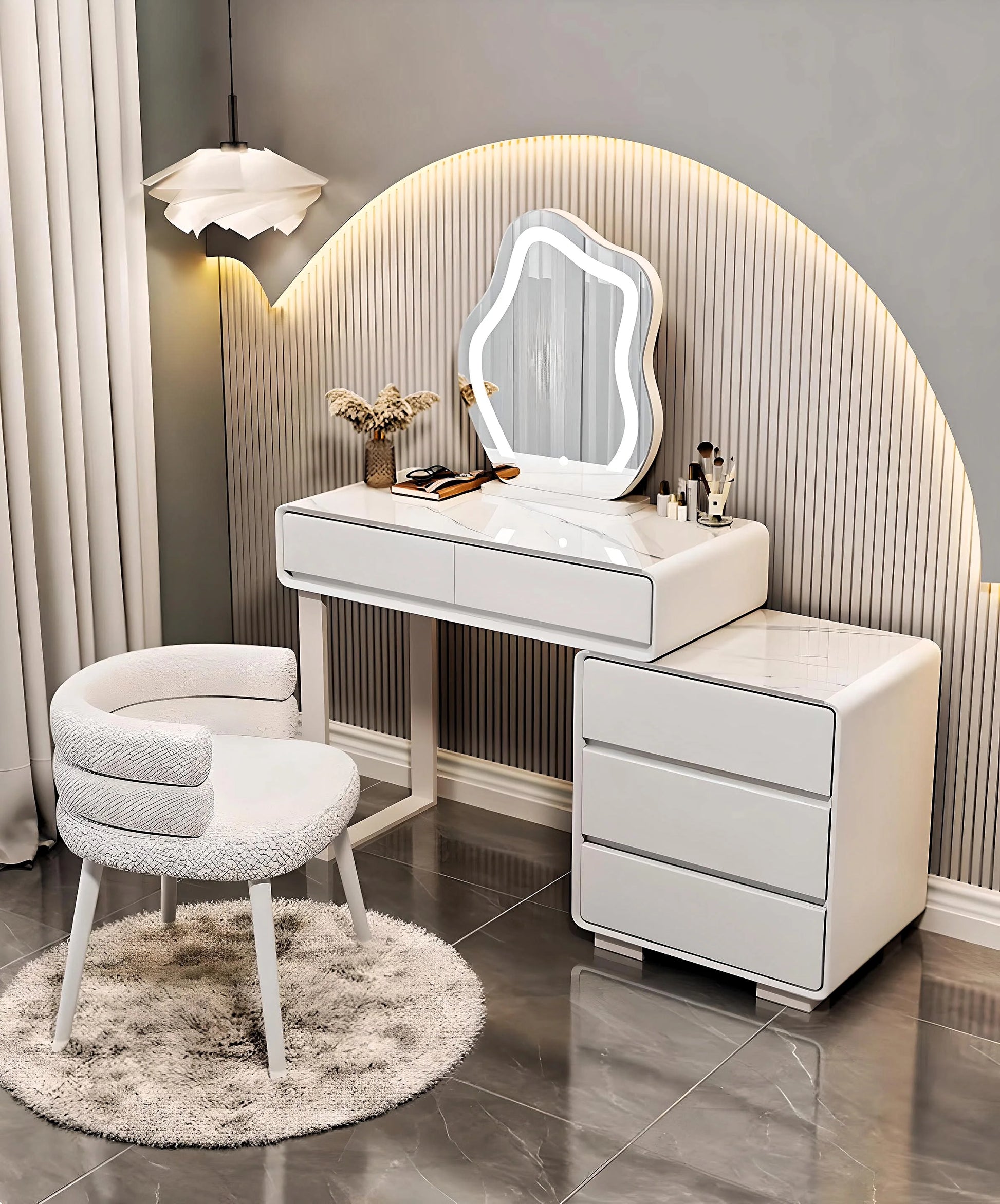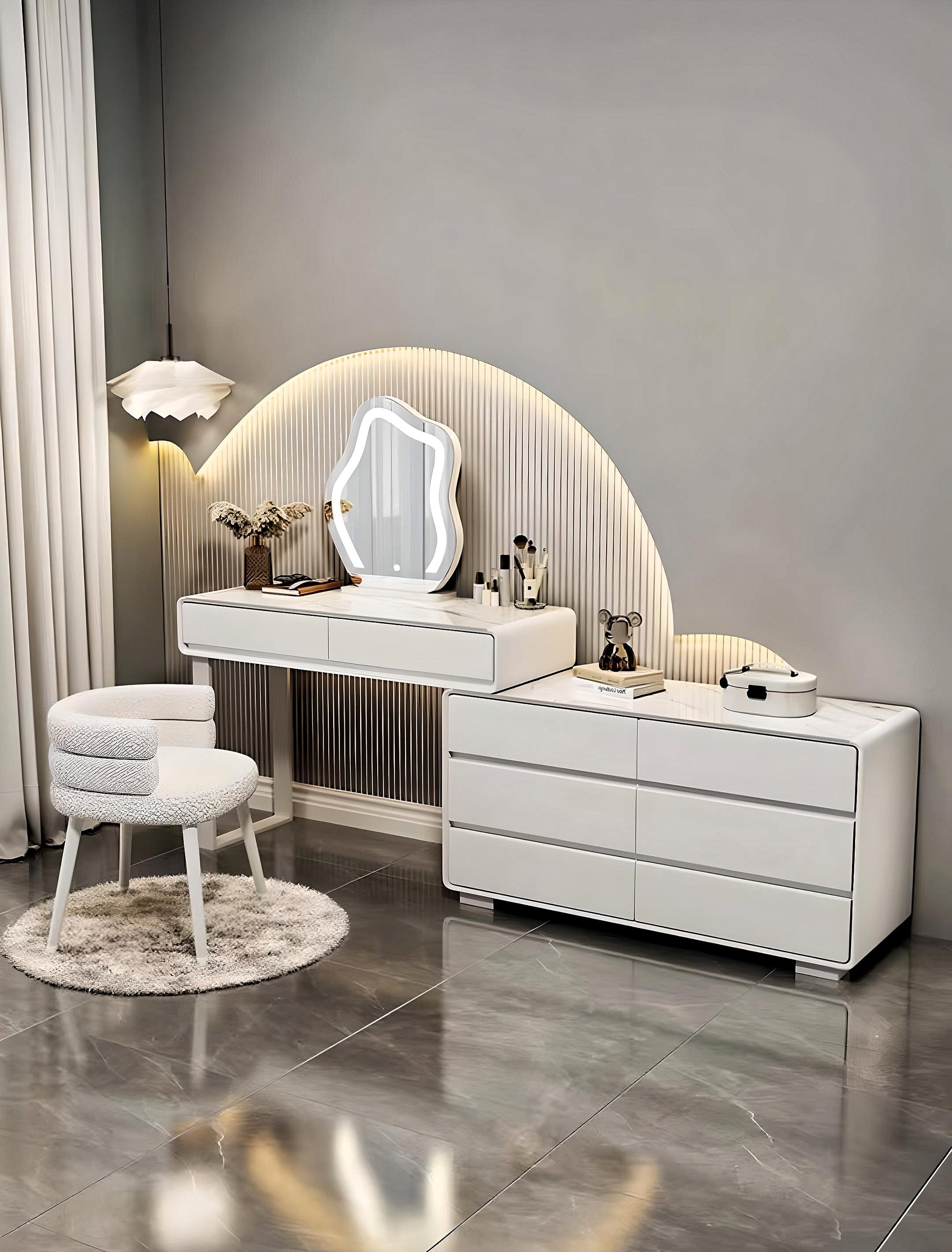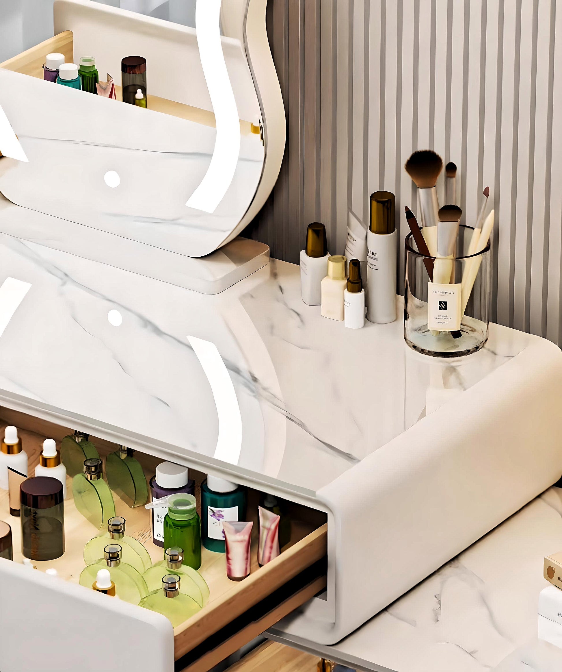 Unveil the celestial charm of your beauty routine with the Celestial Charm Vanity. This luxurious dressing table, known as Glamour Bliss Vanity, is a masterpiece of design and functionality. Crafted from the finest materials, it features an elegant marble top, seamlessly blending with its sleek, polished wood finish. The vanity includes spacious drawers and compartments, perfect for organizing your beauty essentials and accessories. Adorned with delicate gold accents and a grand mirror framed in timeless elegance, the Celestial Charm Vanity transforms any space into a sanctuary of beauty and sophistication. Perfect for those who cherish the art of self-care, this vanity is a testament to grace, luxury, and refined style.