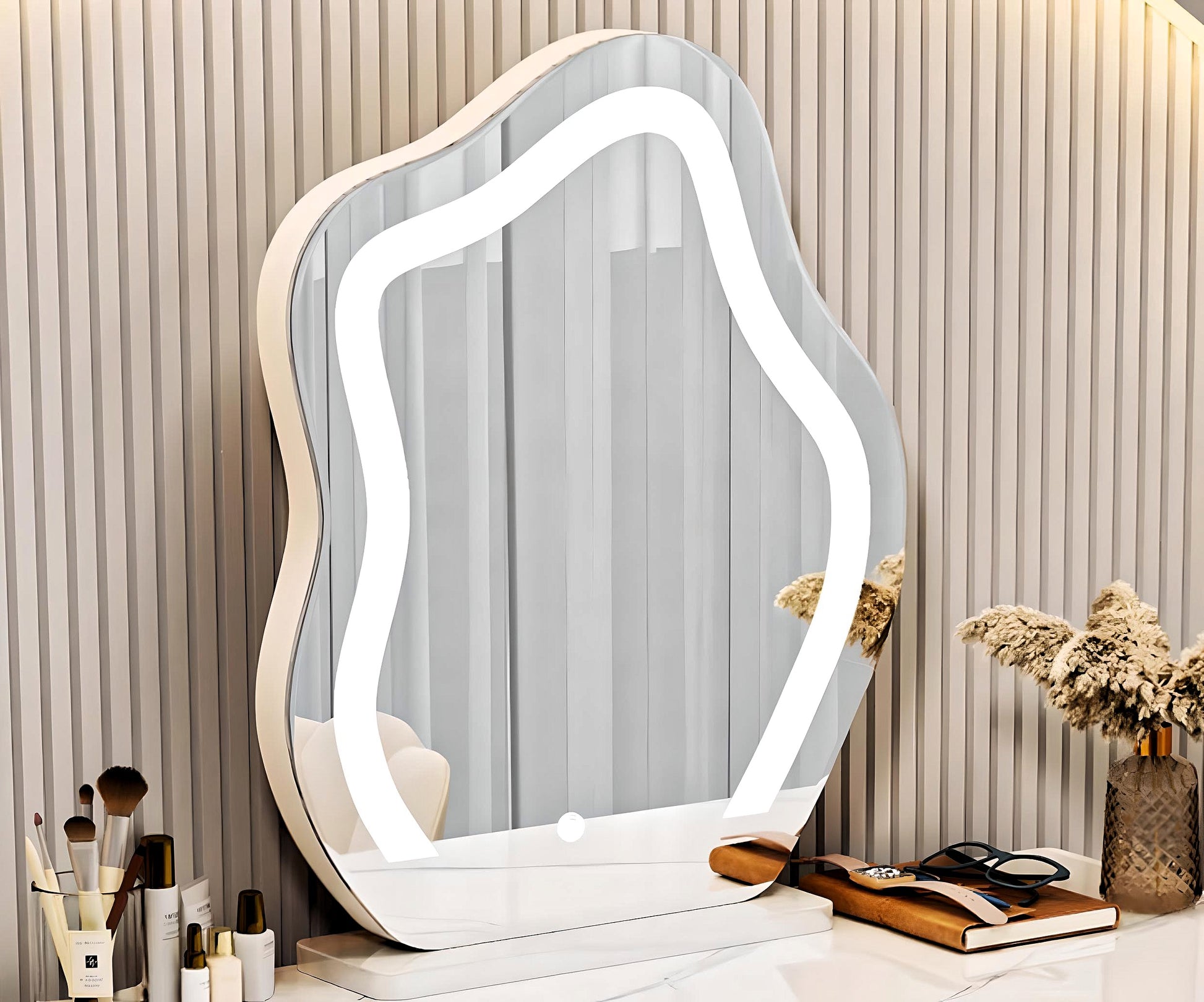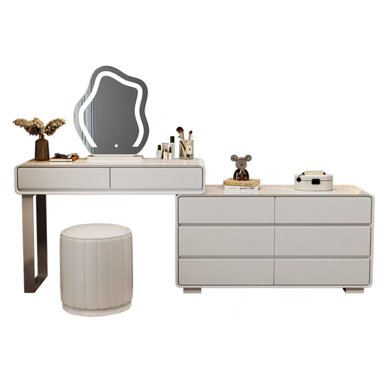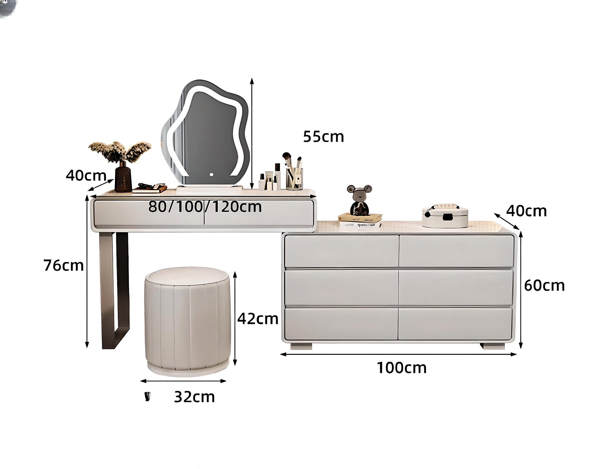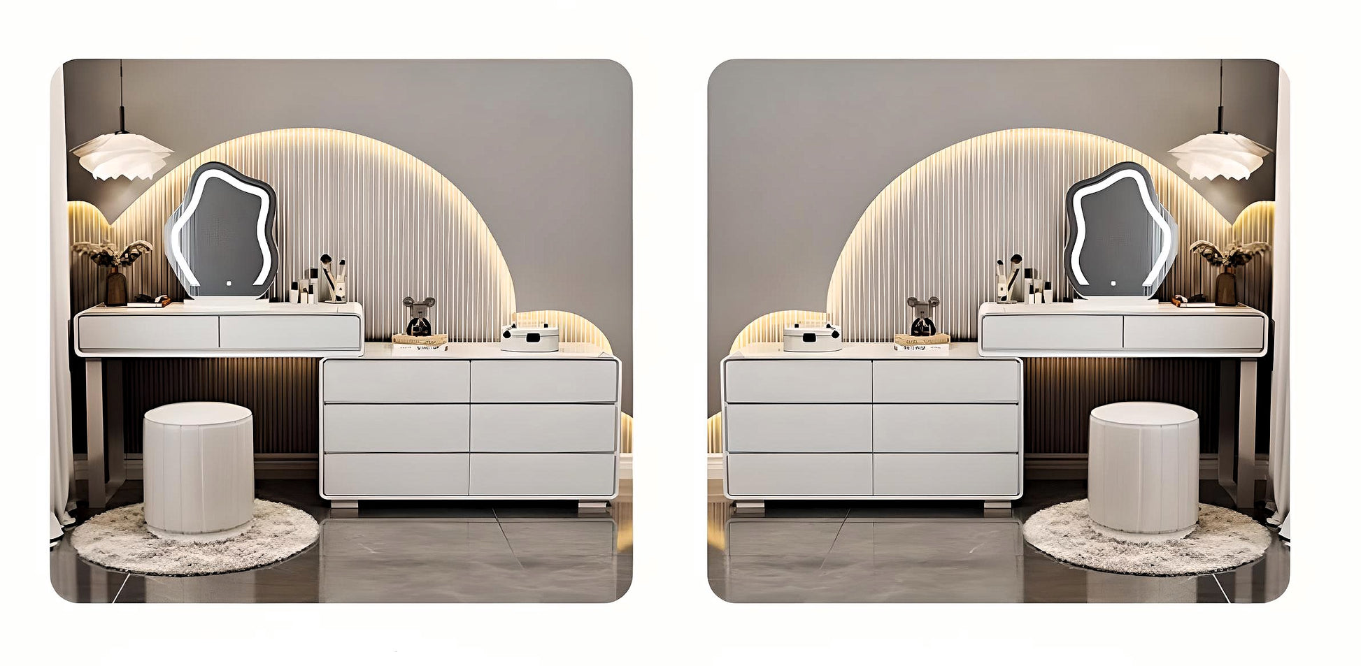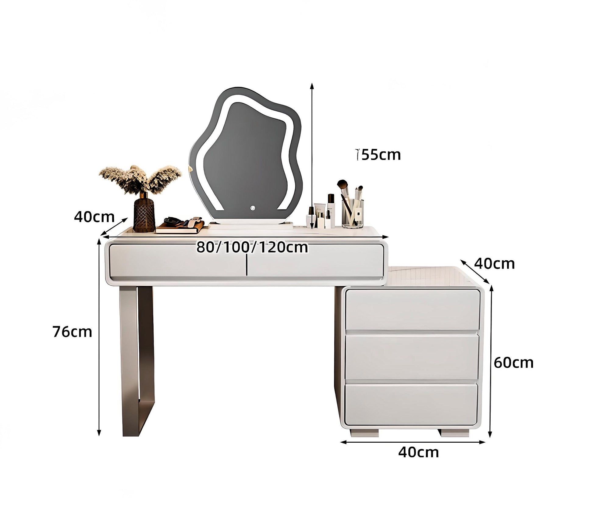 Unveil the celestial charm of your beauty routine with the Celestial Charm Vanity. This luxurious dressing table, known as Glamour Bliss Vanity, is a masterpiece of design and functionality. Crafted from the finest materials, it features an elegant marble top, seamlessly blending with its sleek, polished wood finish. The vanity includes spacious drawers and compartments, perfect for organizing your beauty essentials and accessories. Adorned with delicate gold accents and a grand mirror framed in timeless elegance, the Celestial Charm Vanity transforms any space into a sanctuary of beauty and sophistication. Perfect for those who cherish the art of self-care, this vanity is a testament to grace, luxury, and refined style.
