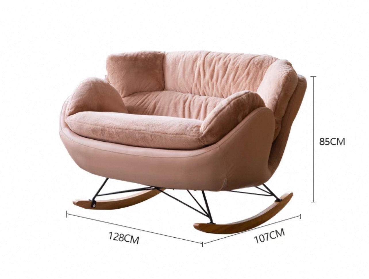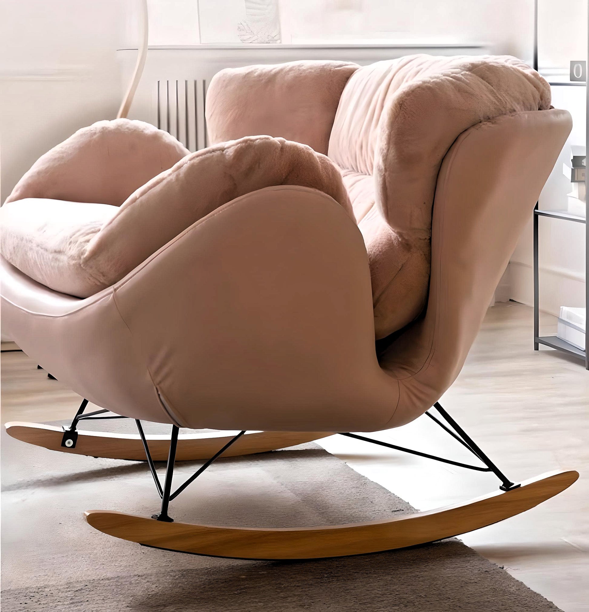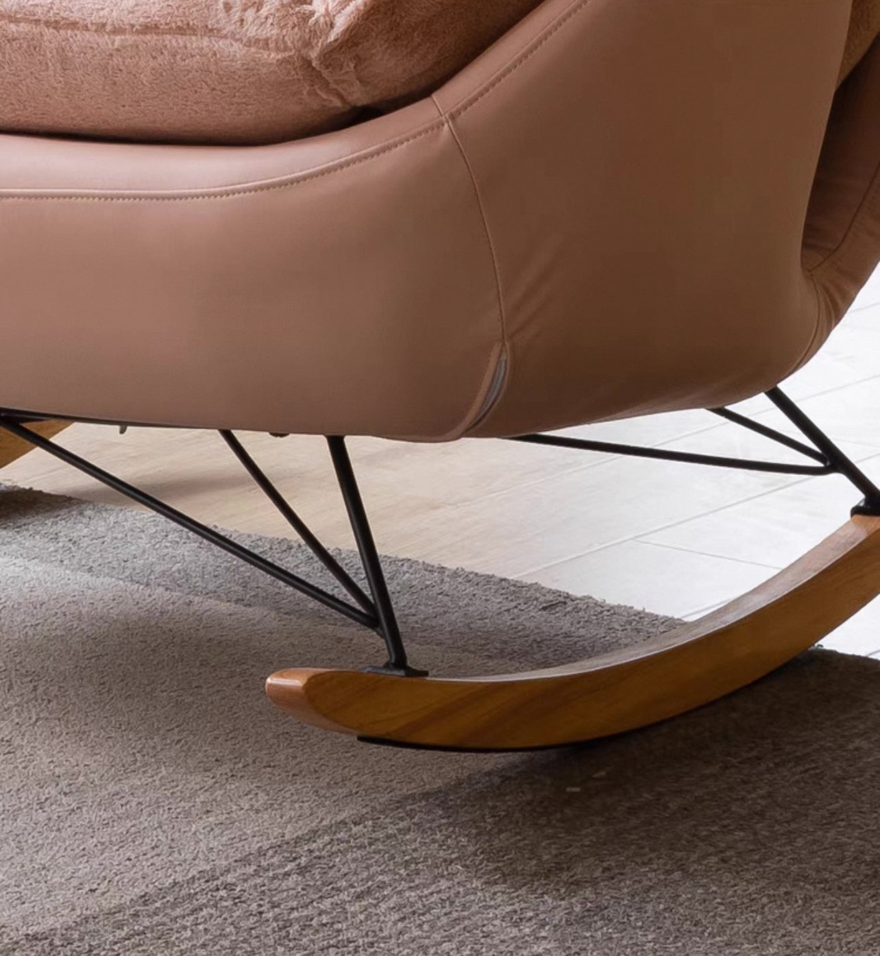 Designed with a durable metal frame and solid wood rocking base, this chair seamlessly blends contemporary aesthetics with classic charm. The wide cushioned seat and plush armrests ensure superior comfort, while the sturdy base provides smooth, gentle rocking motion.