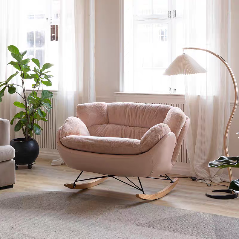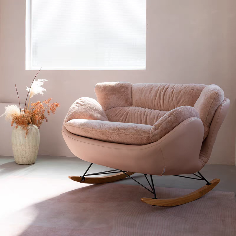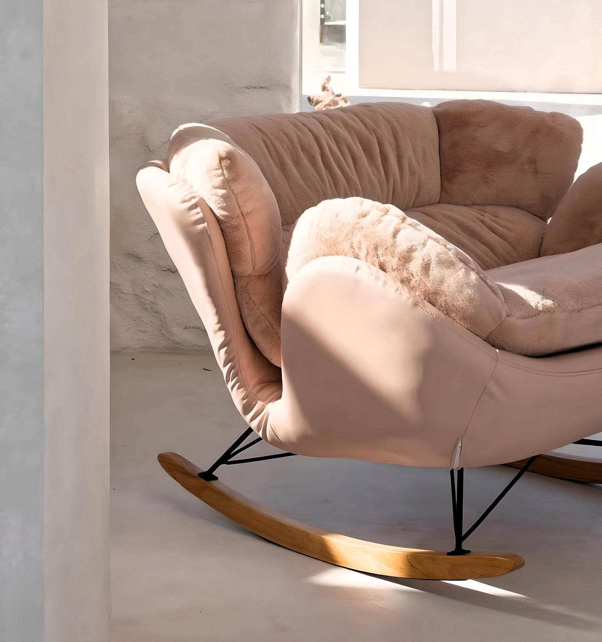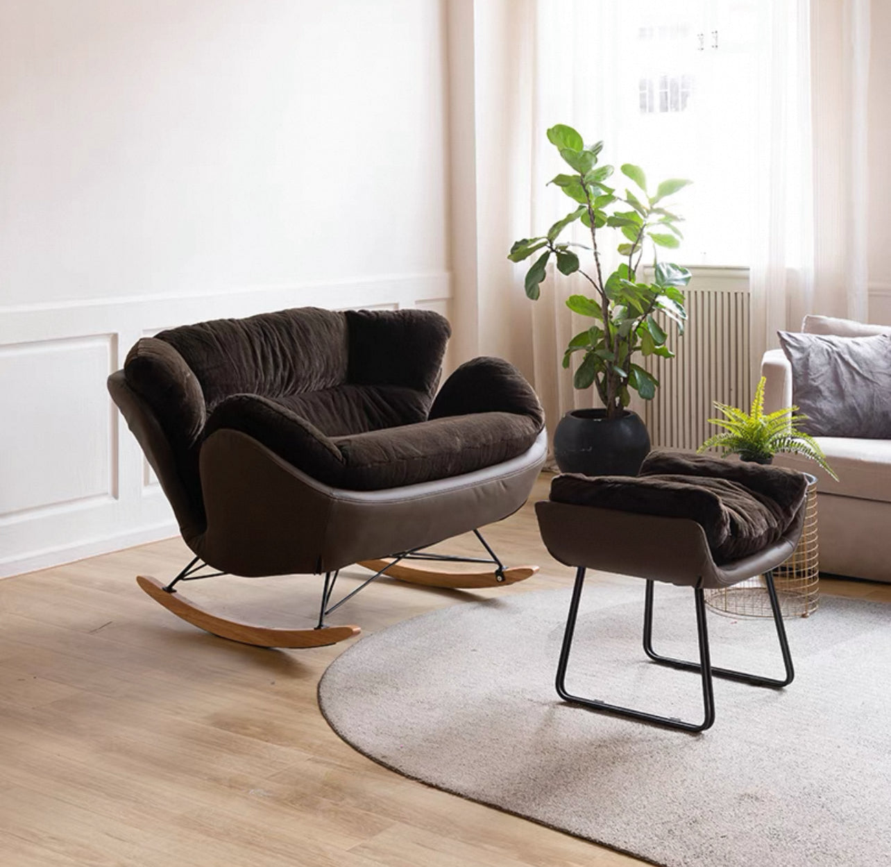 Designed with a durable metal frame and solid wood rocking base, this chair seamlessly blends contemporary aesthetics with classic charm. The wide cushioned seat and plush armrests ensure superior comfort, while the sturdy base provides smooth, gentle rocking motion.