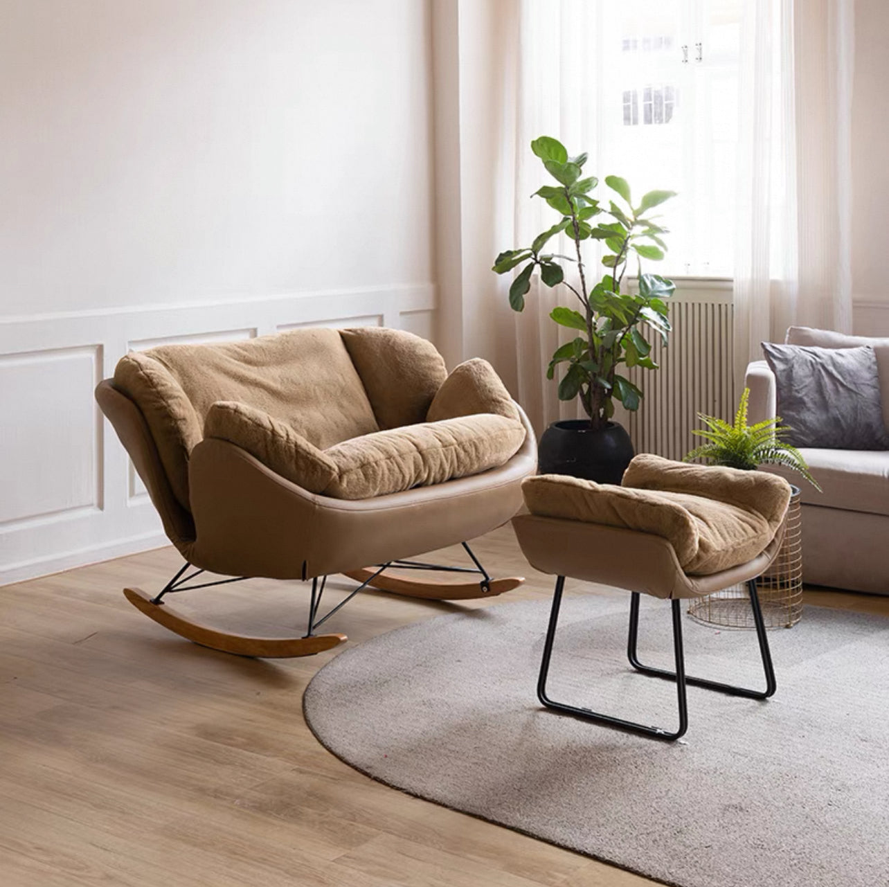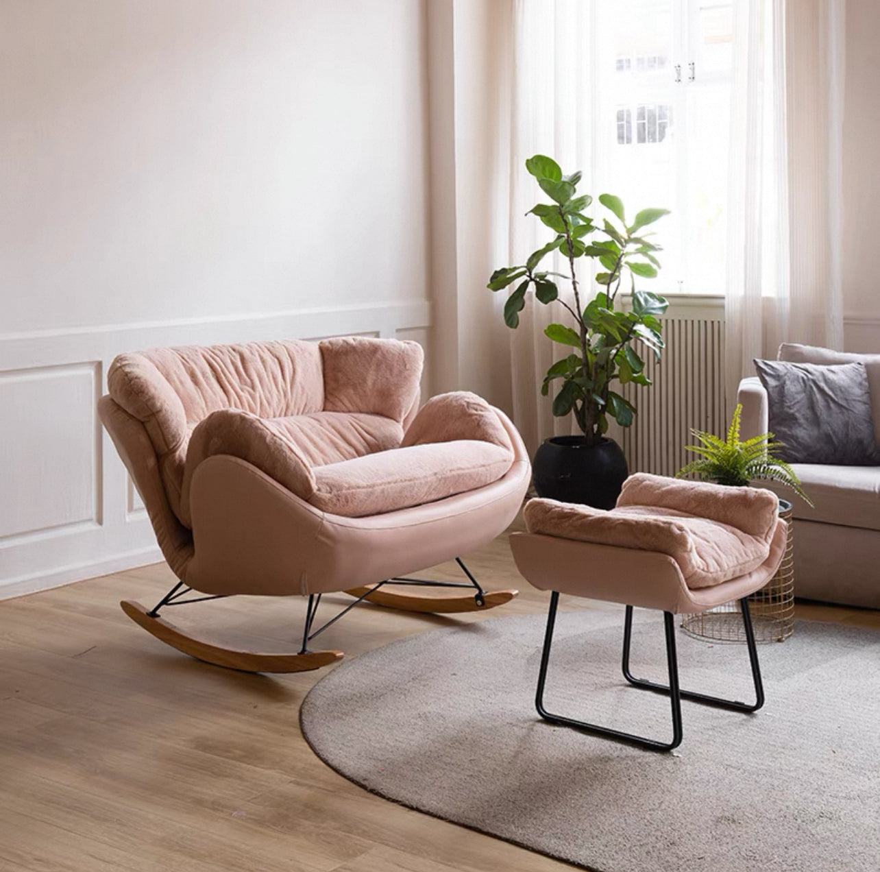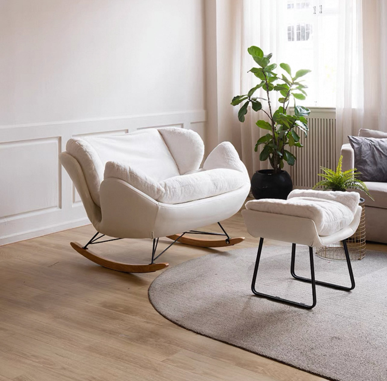 Indulge in ultimate relaxation with the CloudRock Luxe Rocking Chair Set—where plush comfort meets modern elegance. This beautifully crafted rocking chair features a sleek, ergonomic design, enveloped in ultra-soft faux fur upholstery for a cozy, cloud-like feel. Paired with a matching ottoman, it provides exceptional lumbar support, making it perfect for lounging, reading, or unwinding after a long day.
