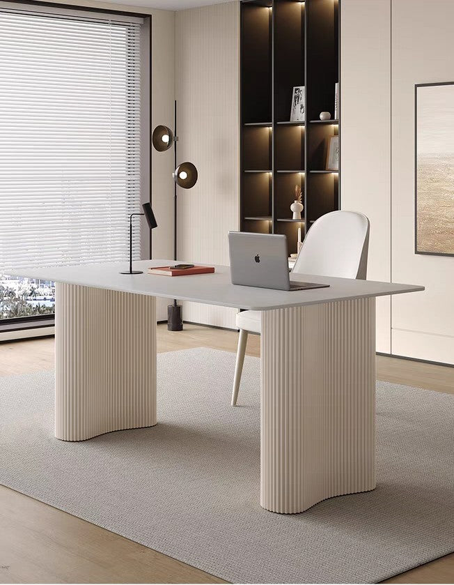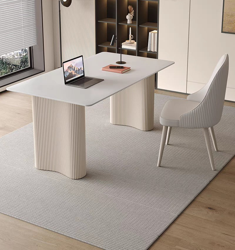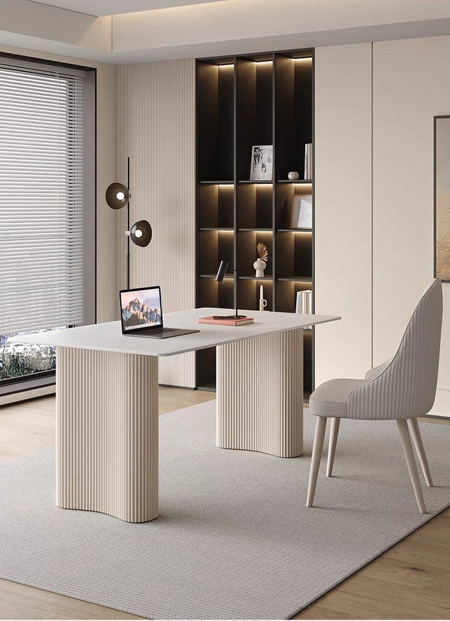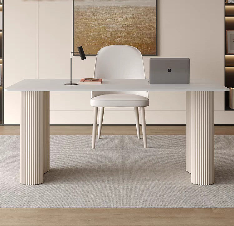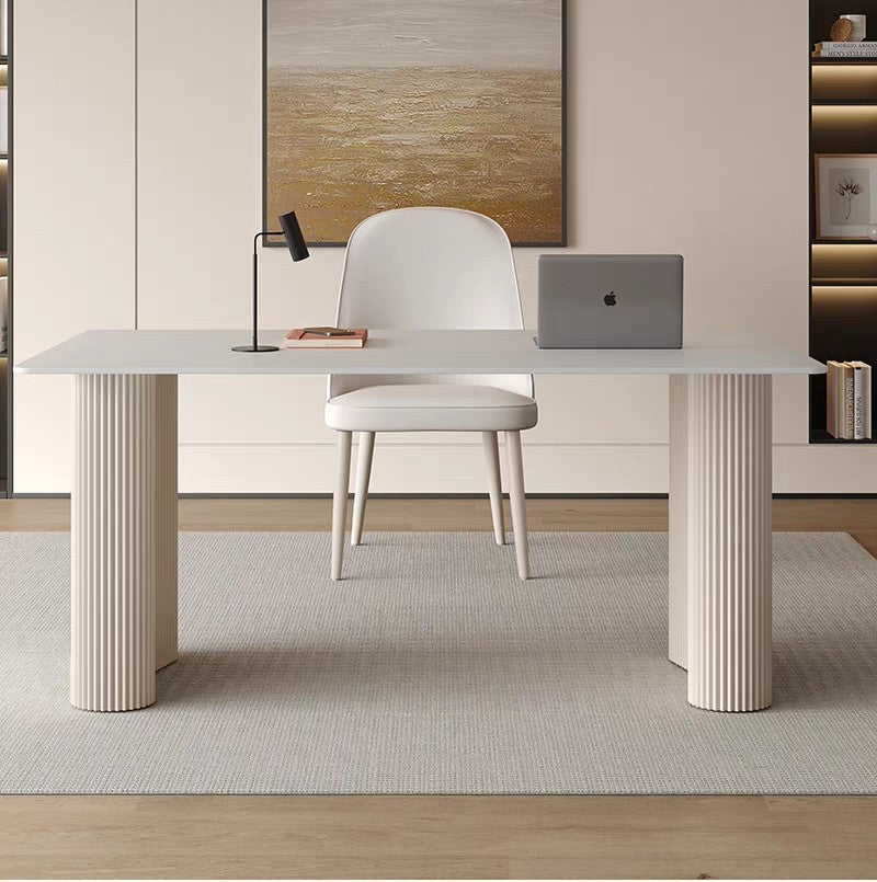 The “Columnar Elegance Desk” – where functionality meets artistry. Crafted for the contemporary professional, this statement piece transforms any room into a haven of creativity and efficiency. With its striking ribbed cylindrical legs and pristine white finish, it exudes sophistication that stands out in any decor. The spacious tabletop provides ample room for your ideas to unfold, while the sturdy design ensures lasting durability.