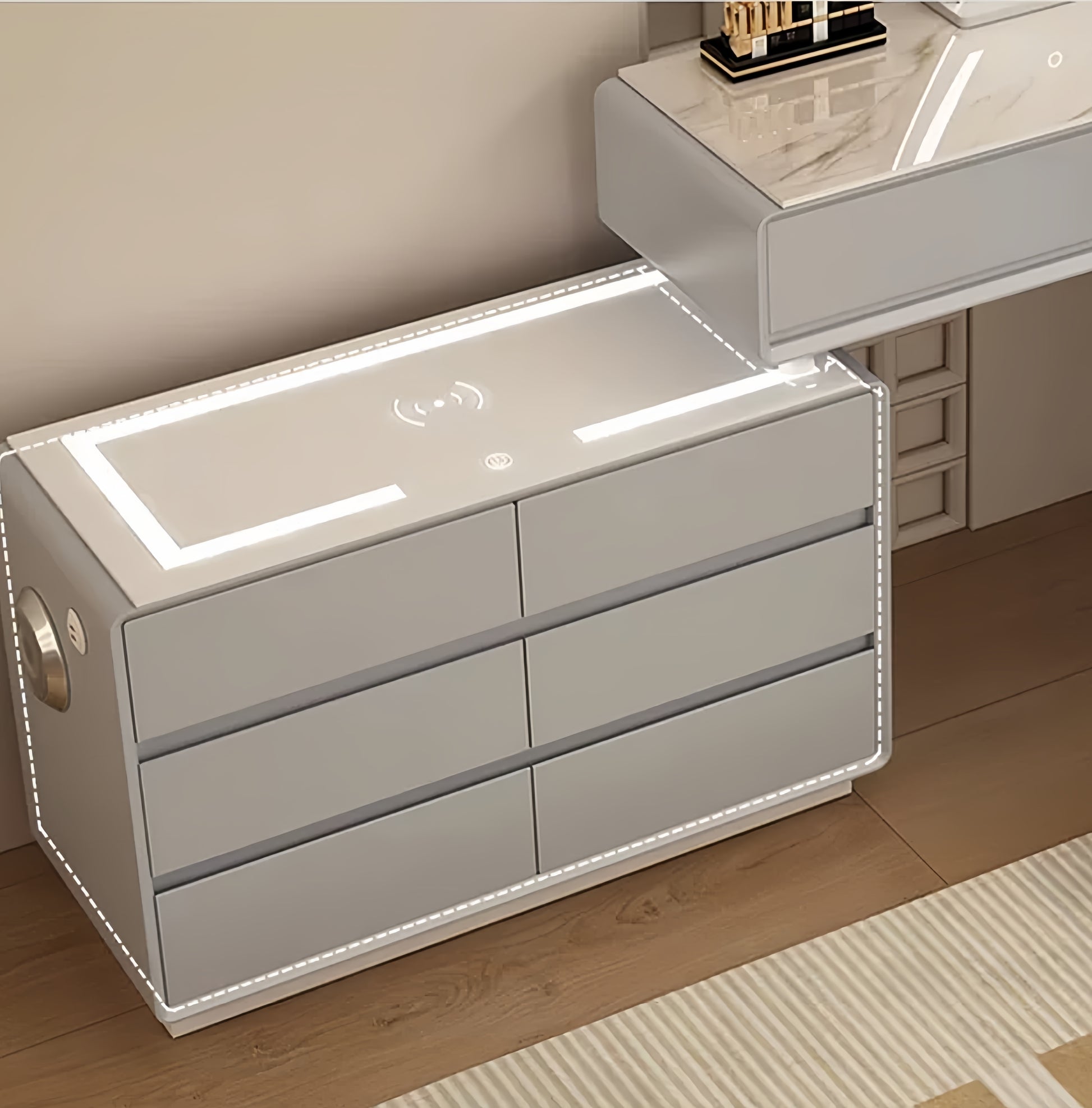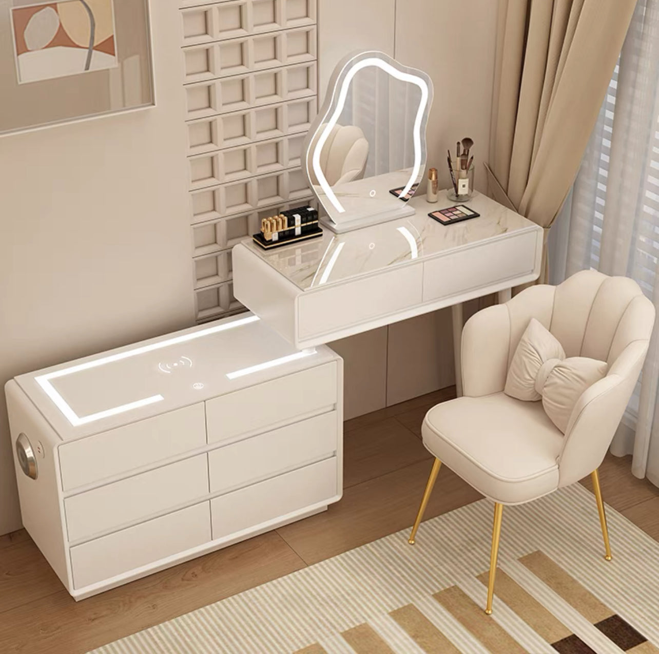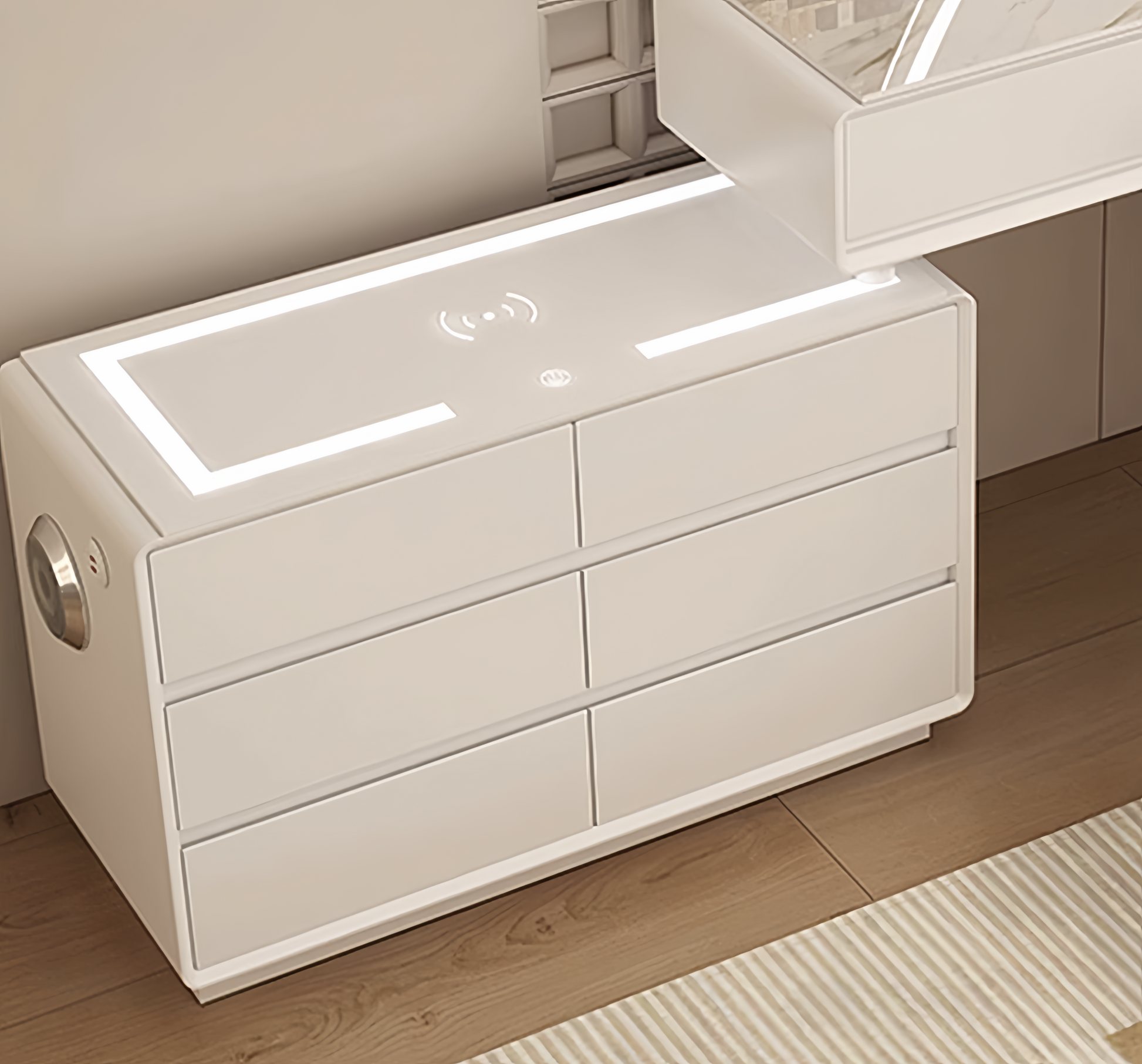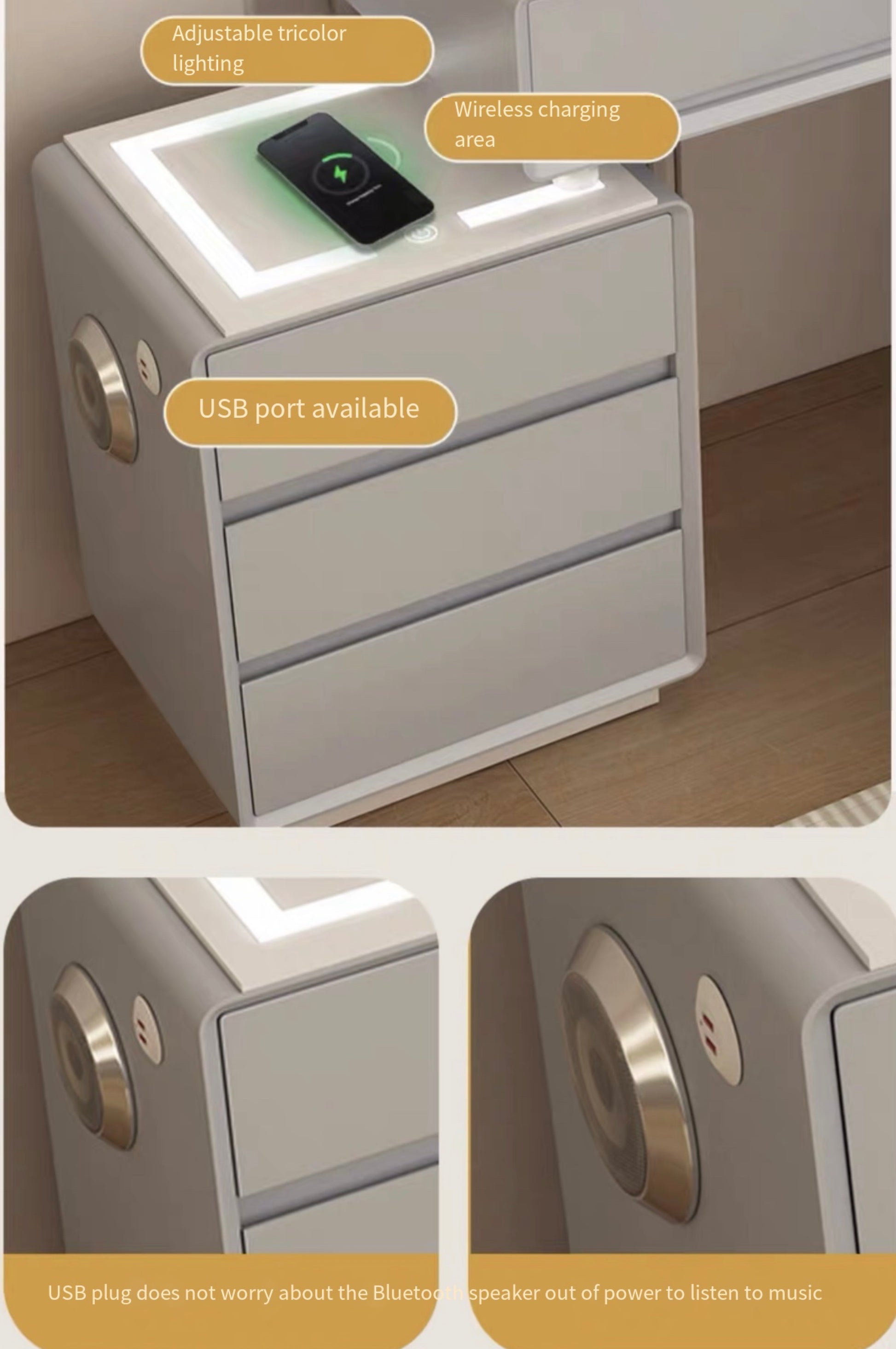 But the Eclat is more than just a visual delight. Embedded within its sleek design is a state-of-the-art wireless charging pad, allowing you to power up your devices without the clutter of cords. Accompanying this feature is an integrated speaker system, enabling you to set the mood with your favorite music as you prepare for the day or unwind in the evening.