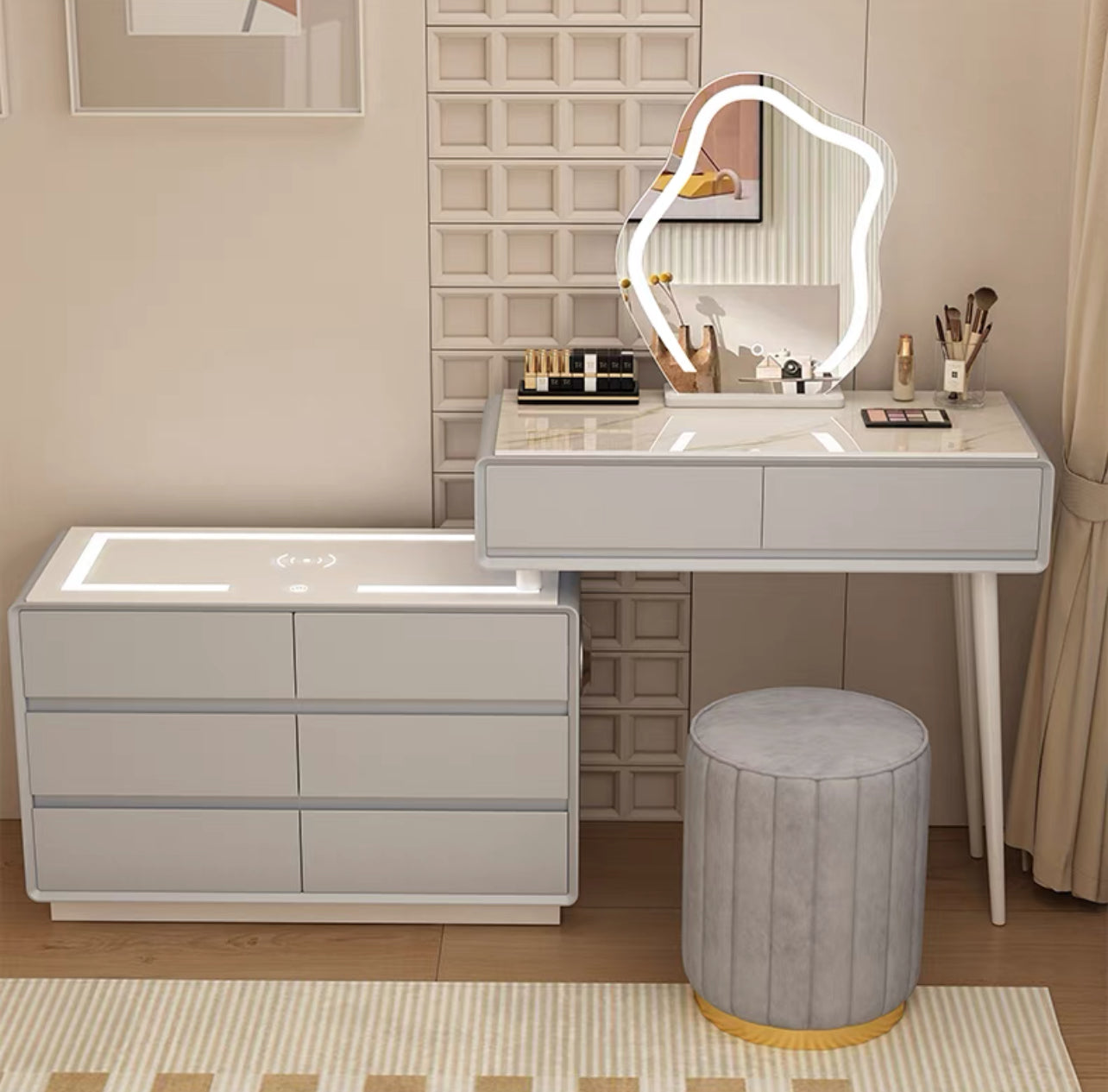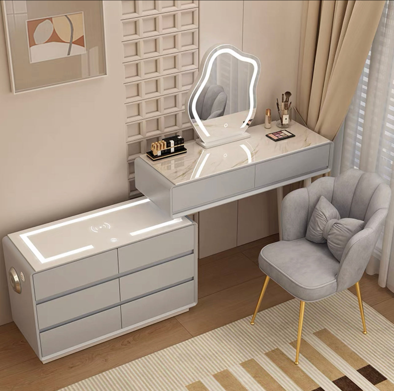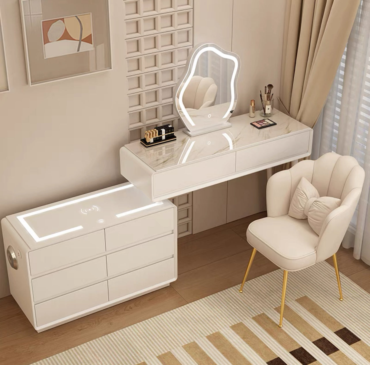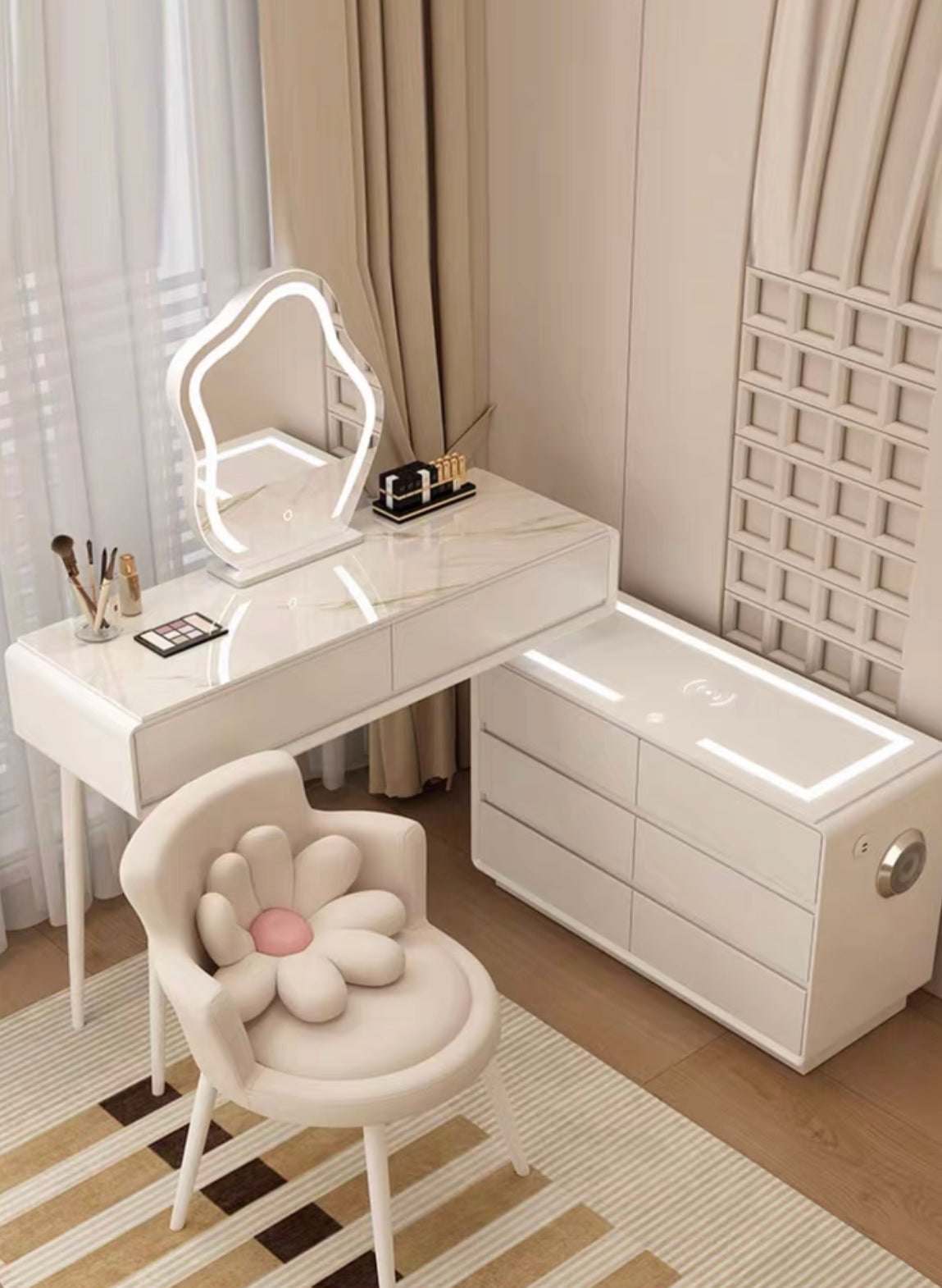 The Eclat Vanity Suite boasts a high-gloss finish, complemented by a marble surface that exudes sophistication. Its mirror, framed by ambient lighting, provides the perfect illumination for your beauty routine, ensuring every detail is placed in the best light.