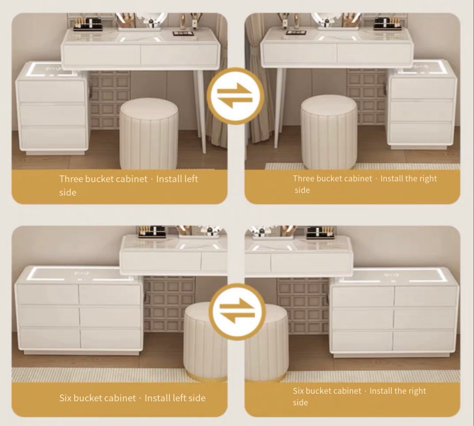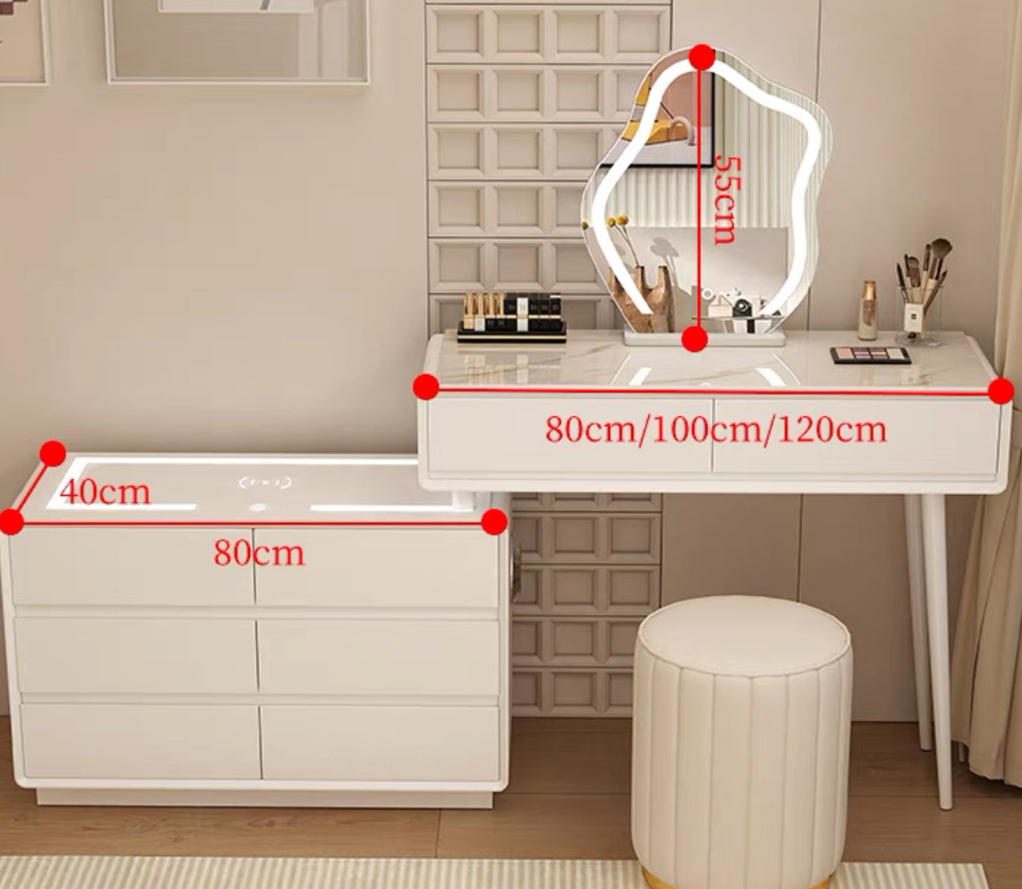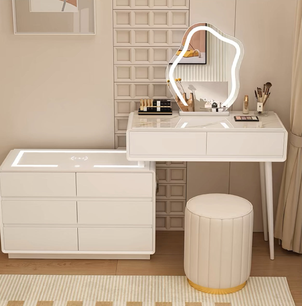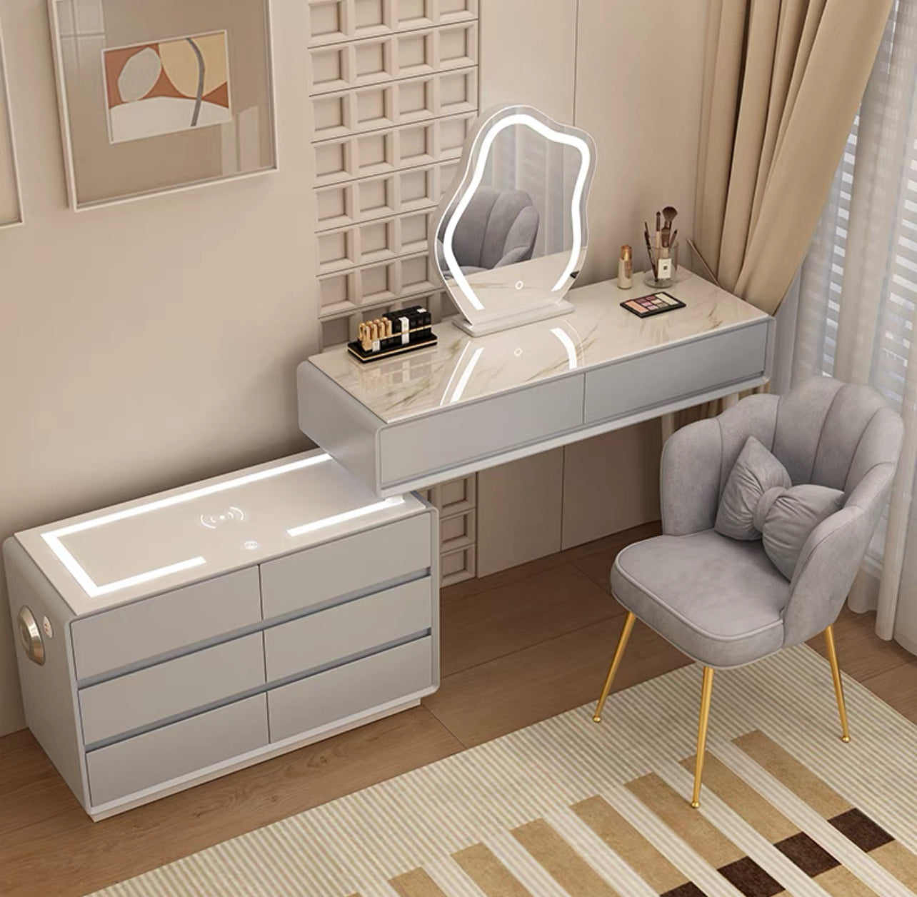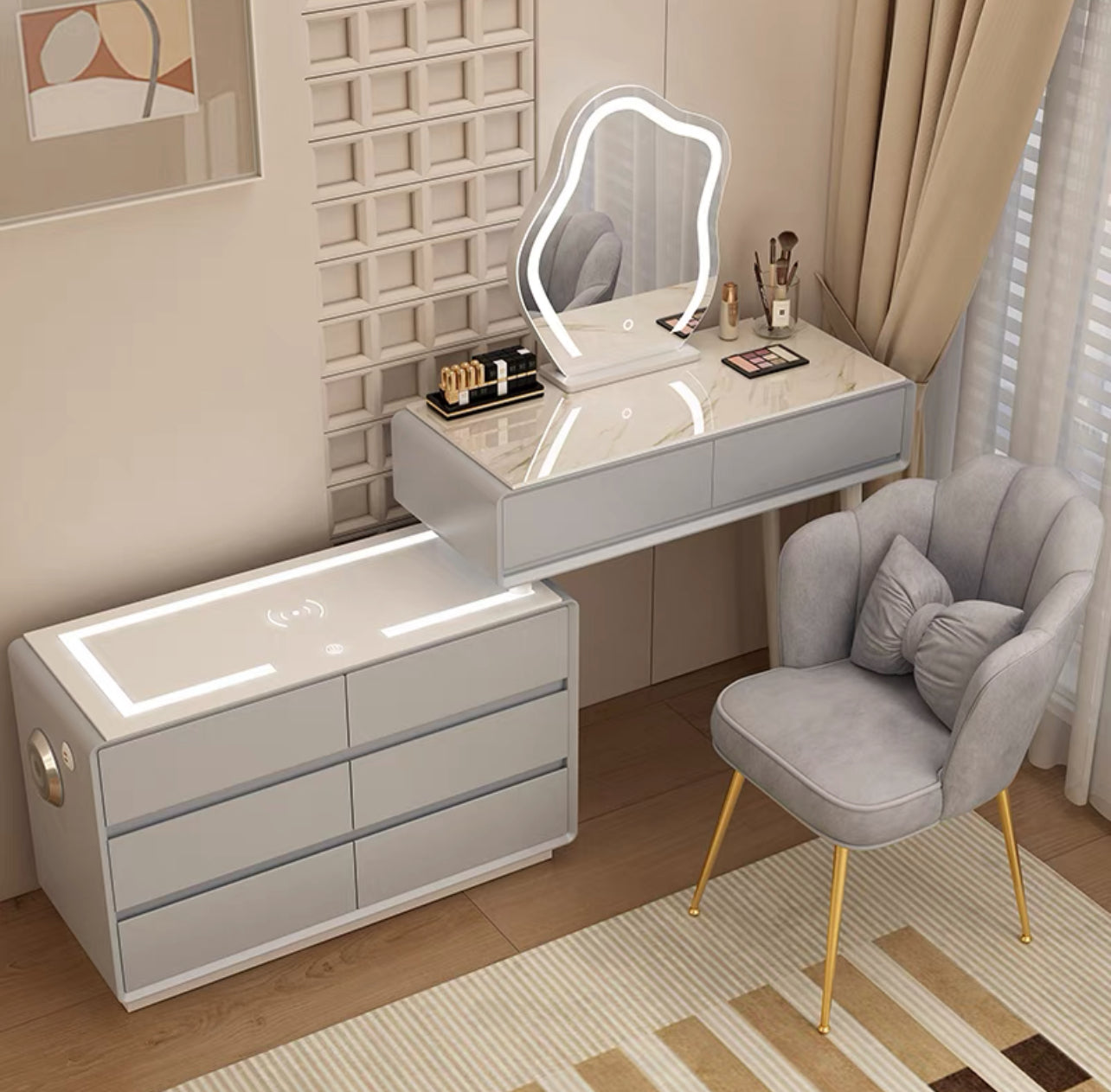 The Eclat Vanity Suite boasts a high-gloss finish, complemented by a marble surface that exudes sophistication. Its mirror, framed by ambient lighting, provides the perfect illumination for your beauty routine, ensuring every detail is placed in the best light.