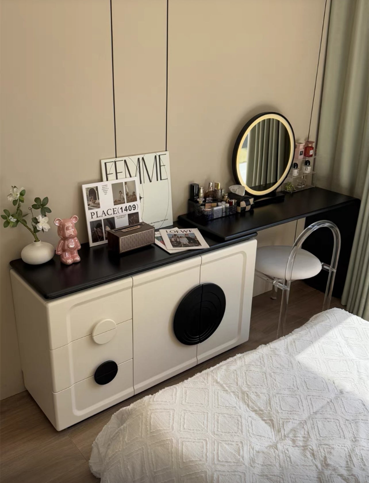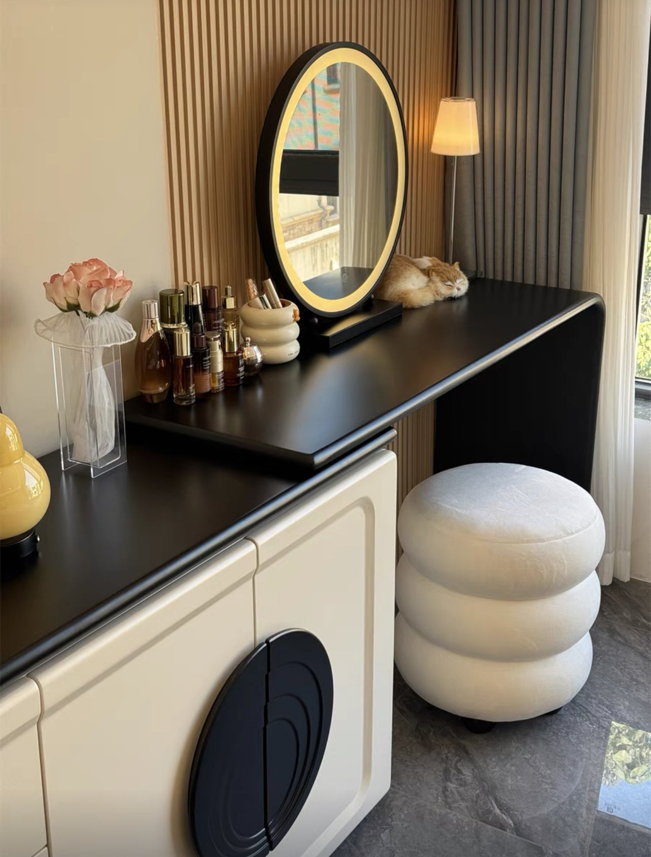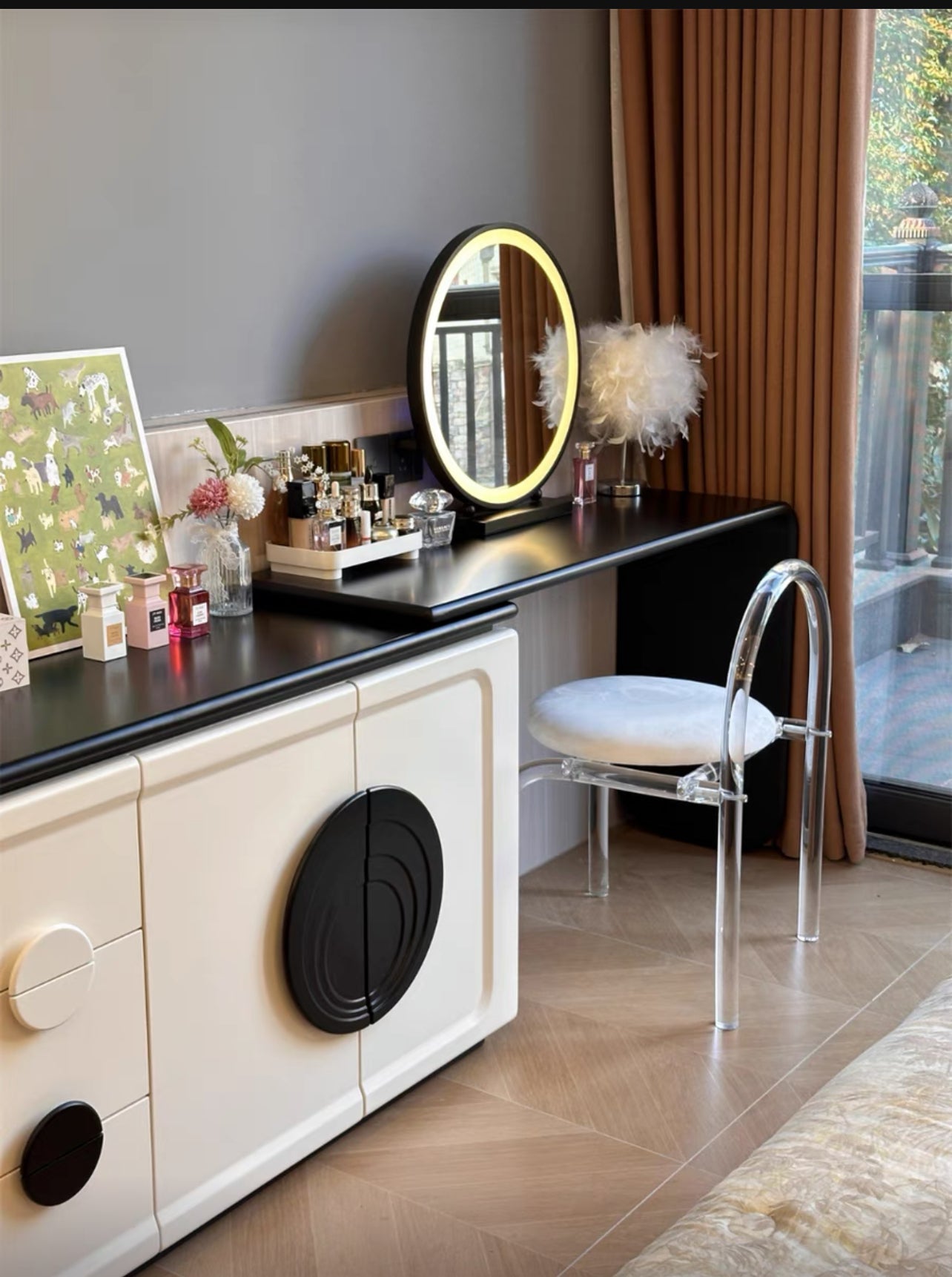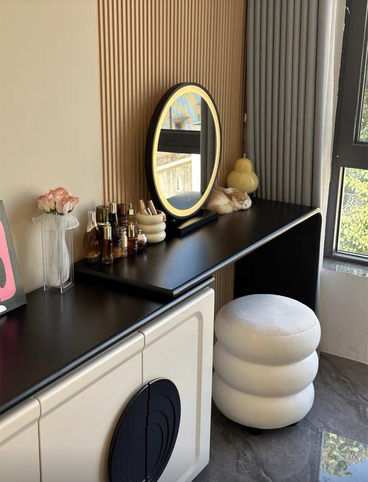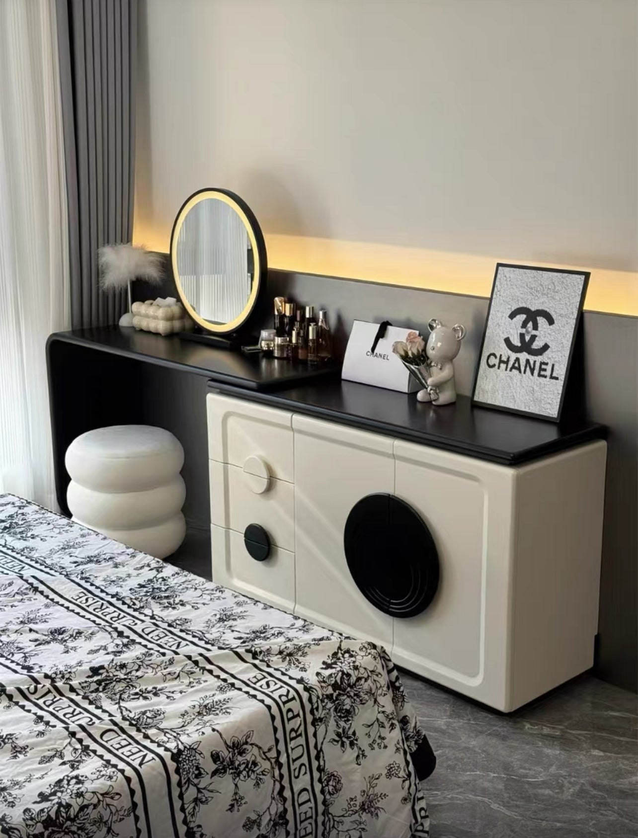 Elevate your space with the Eclipse Harmony Vanity Set, a striking blend of modern elegance and functional sophistication. Featuring a seamless black-and-white contrast, this luxury dressing table boasts a sleek curved extension, a round LED mirror, and spacious storage with artistic circular accents. The minimalist yet bold design is paired with a plush, cloud-like stool or a sculptural designer chair, creating the ultimate statement piece for any contemporary bedroom or dressing area. Crafted with high-quality materials, this modern makeup vanity offers both style and organization, making it a must-have for beauty lovers and interior enthusiasts alike. Shop now for a refined, space-saving solution with premium craftsmanship!