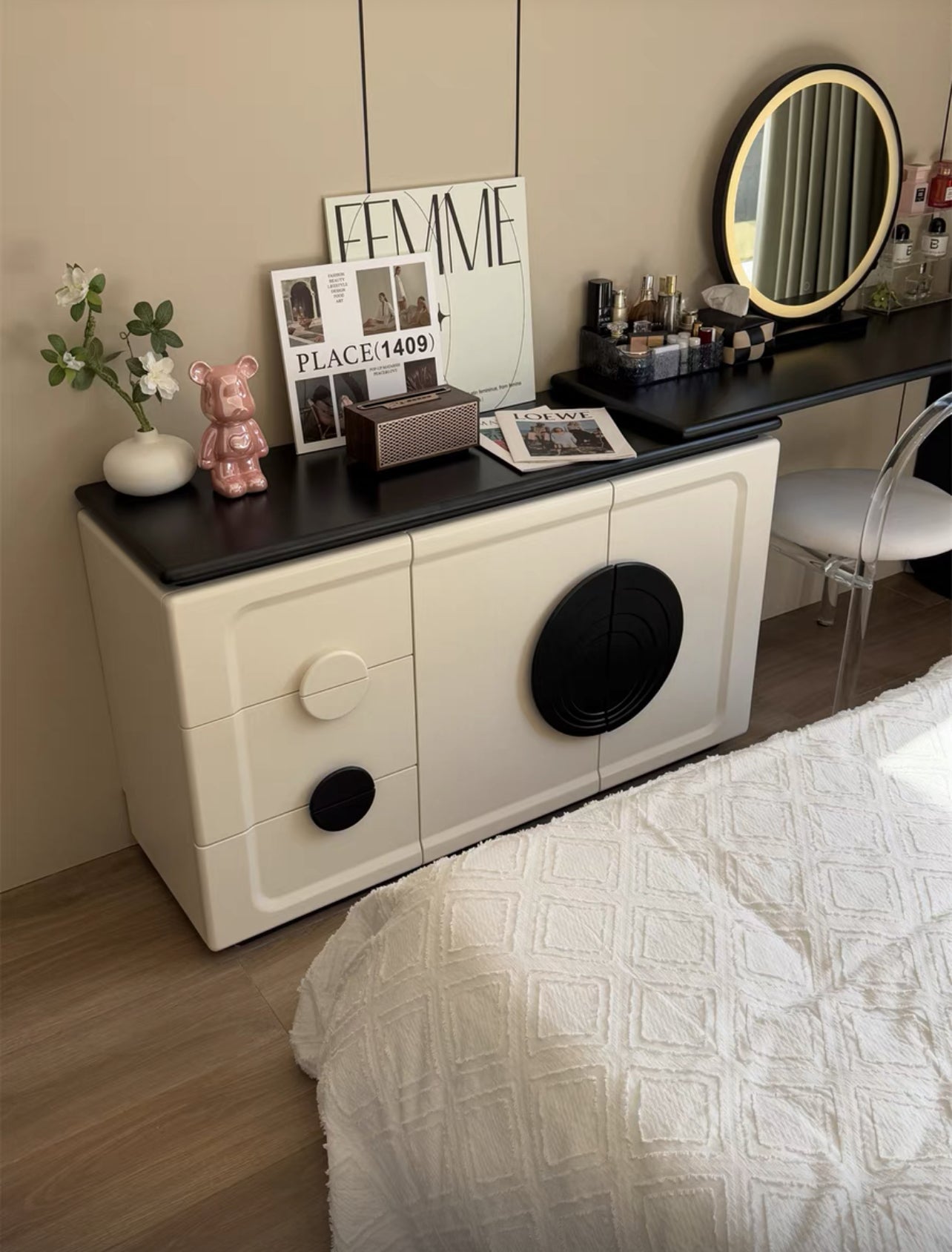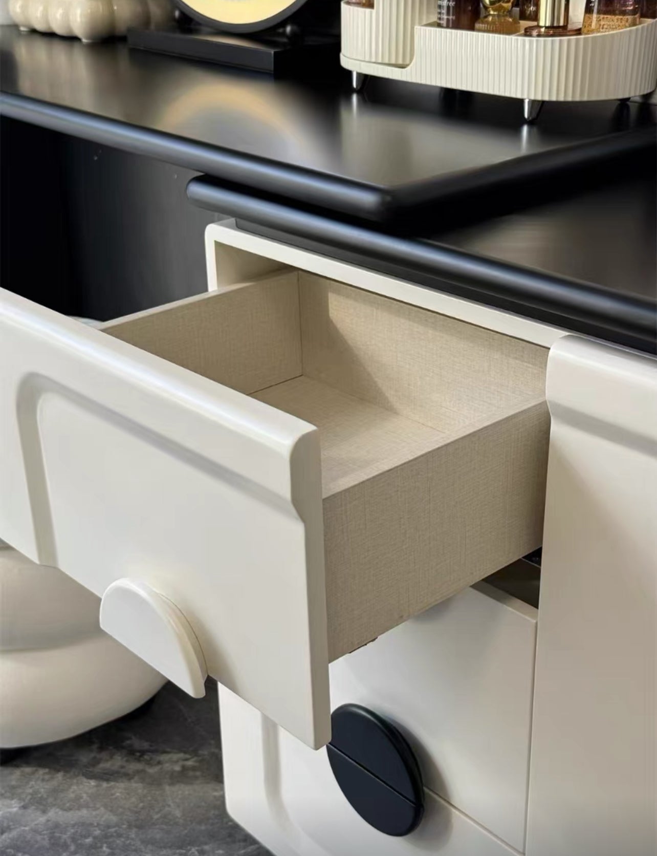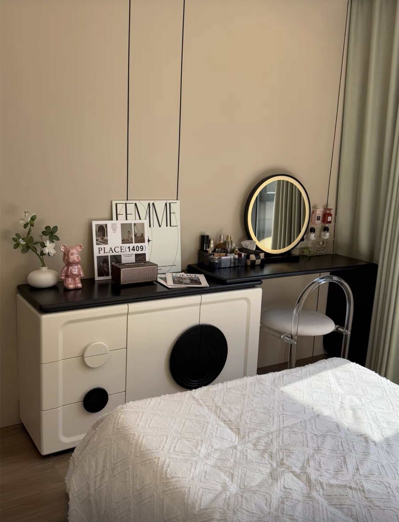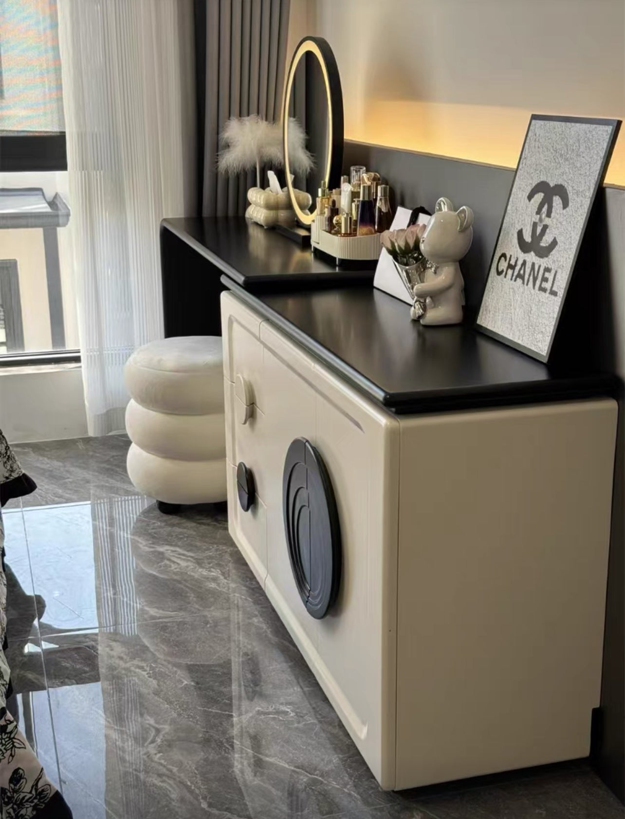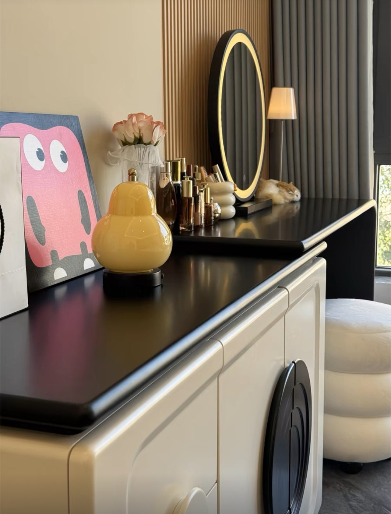 Elevate your space with the Eclipse Harmony Vanity Set, a striking blend of modern elegance and functional sophistication. Featuring a seamless black-and-white contrast, this luxury dressing table boasts a sleek curved extension, a round LED mirror, and spacious storage with artistic circular accents. The minimalist yet bold design is paired with a plush, cloud-like stool or a sculptural designer chair, creating the ultimate statement piece for any contemporary bedroom or dressing area. Crafted with high-quality materials, this modern makeup vanity offers both style and organization, making it a must-have for beauty lovers and interior enthusiasts alike. Shop now for a refined, space-saving solution with premium craftsmanship!
