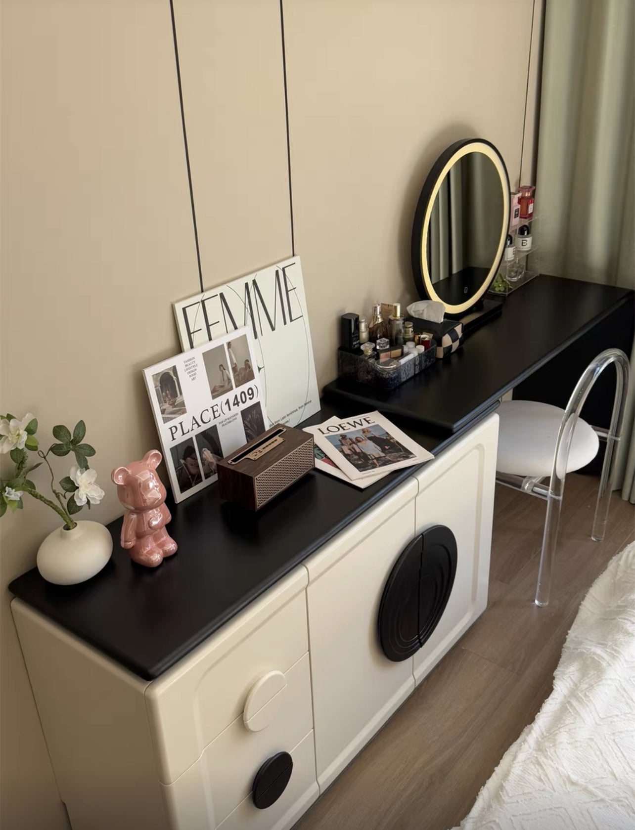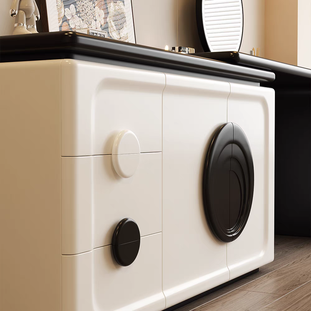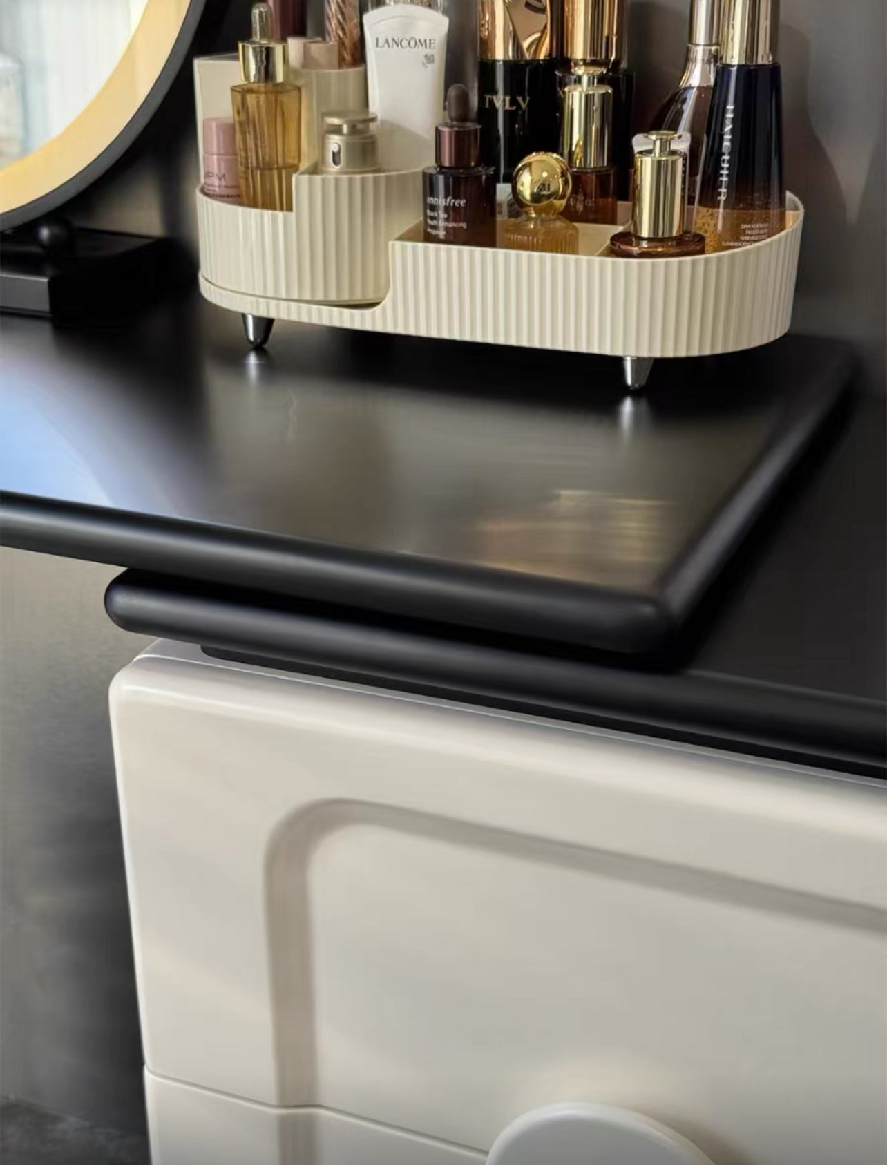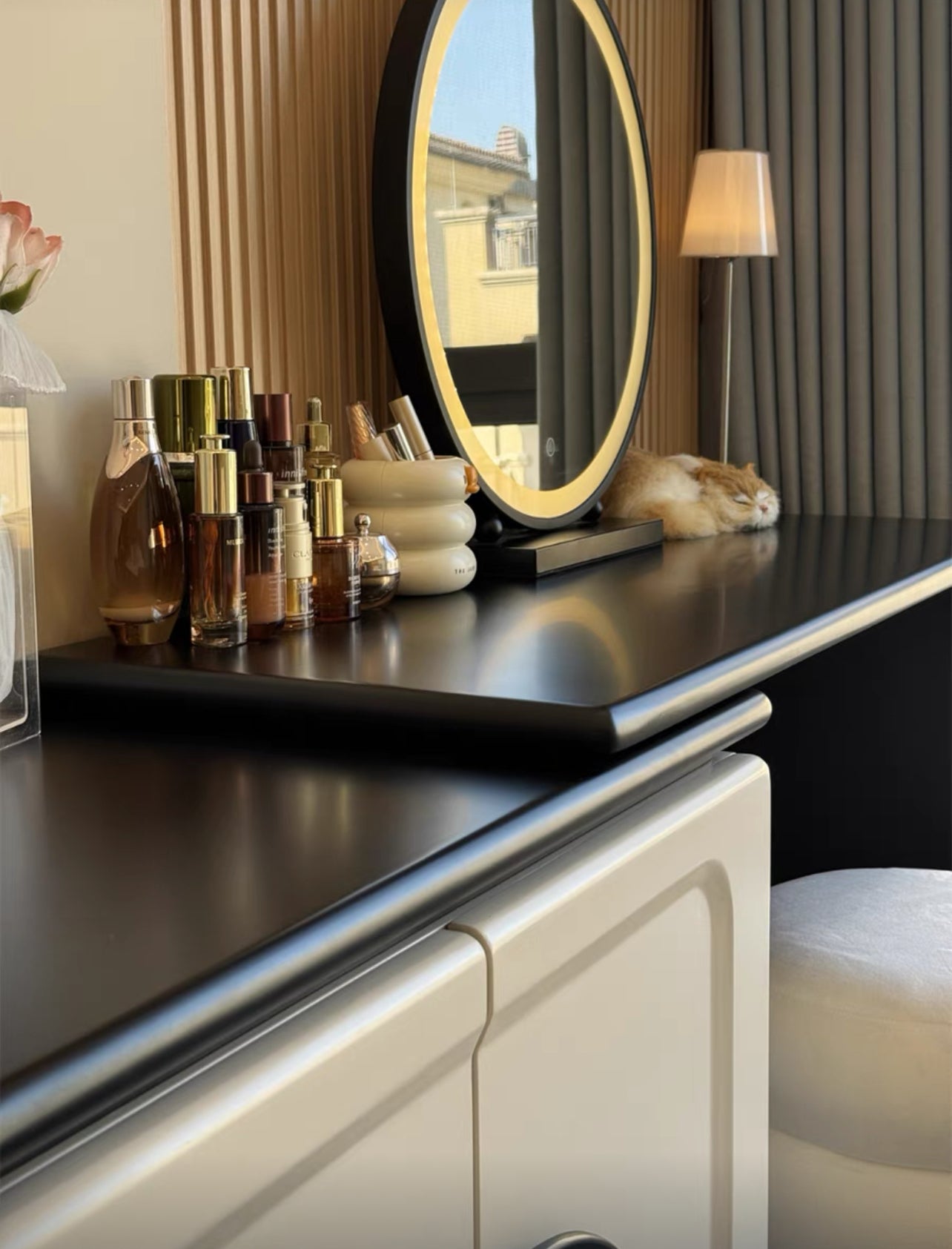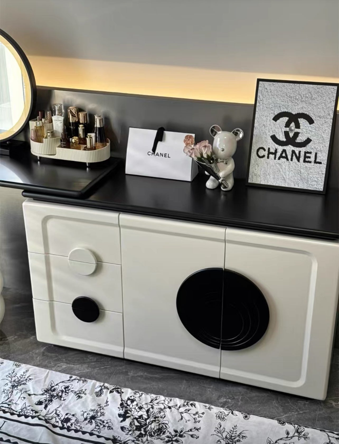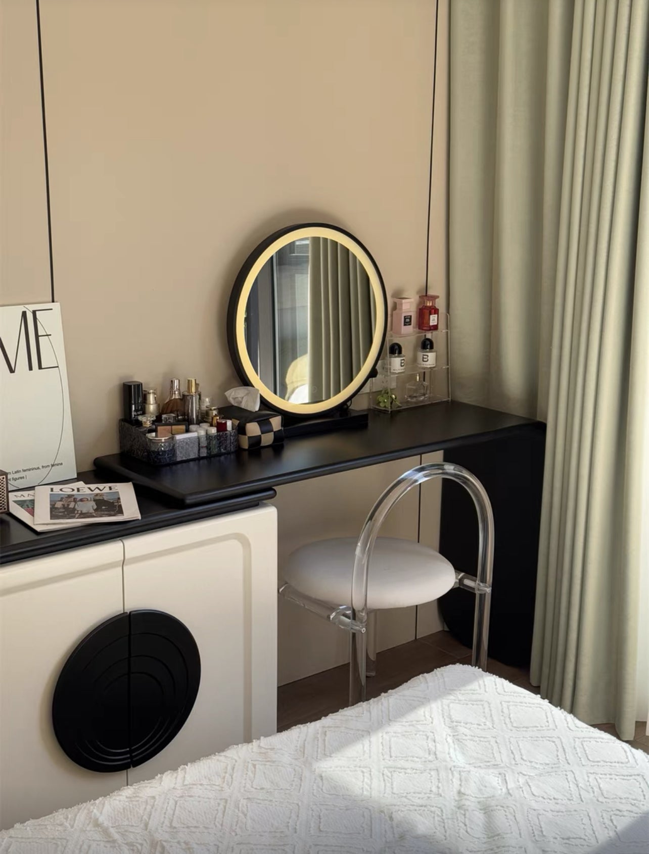 Elevate your space with the Eclipse Harmony Vanity Set, a striking blend of modern elegance and functional sophistication. Featuring a seamless black-and-white contrast, this luxury dressing table boasts a sleek curved extension, a round LED mirror, and spacious storage with artistic circular accents. The minimalist yet bold design is paired with a plush, cloud-like stool or a sculptural designer chair, creating the ultimate statement piece for any contemporary bedroom or dressing area. Crafted with high-quality materials, this modern makeup vanity offers both style and organization, making it a must-have for beauty lovers and interior enthusiasts alike. Shop now for a refined, space-saving solution with premium craftsmanship!