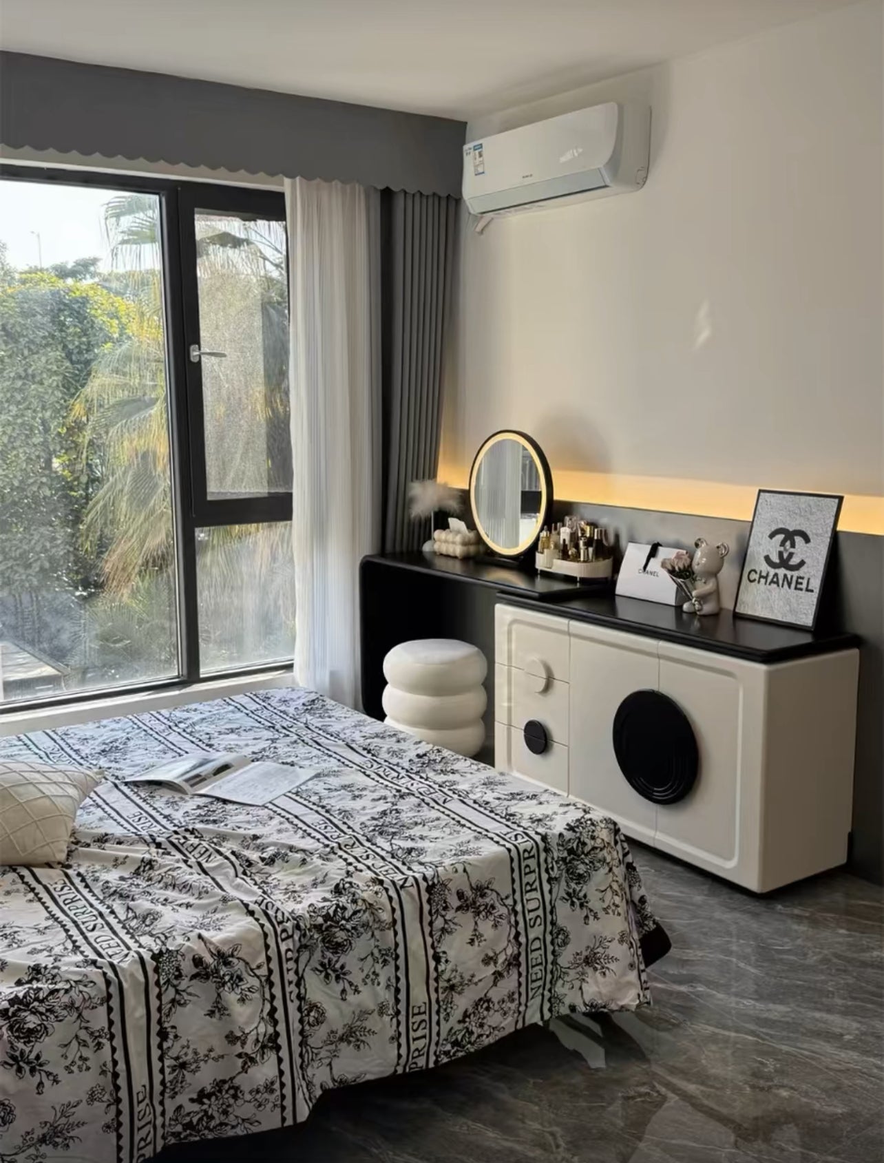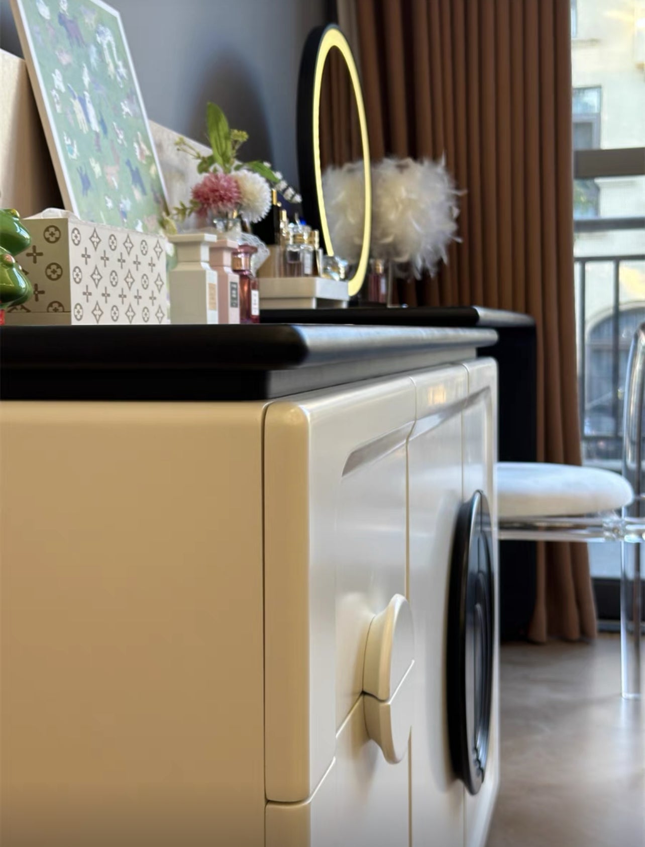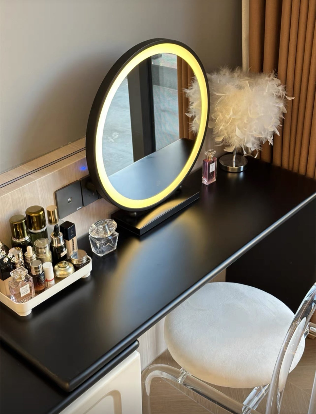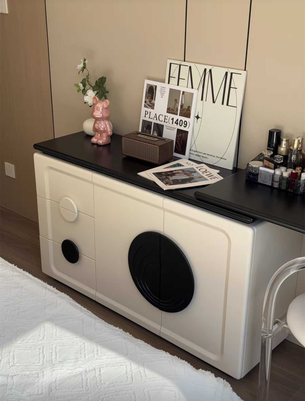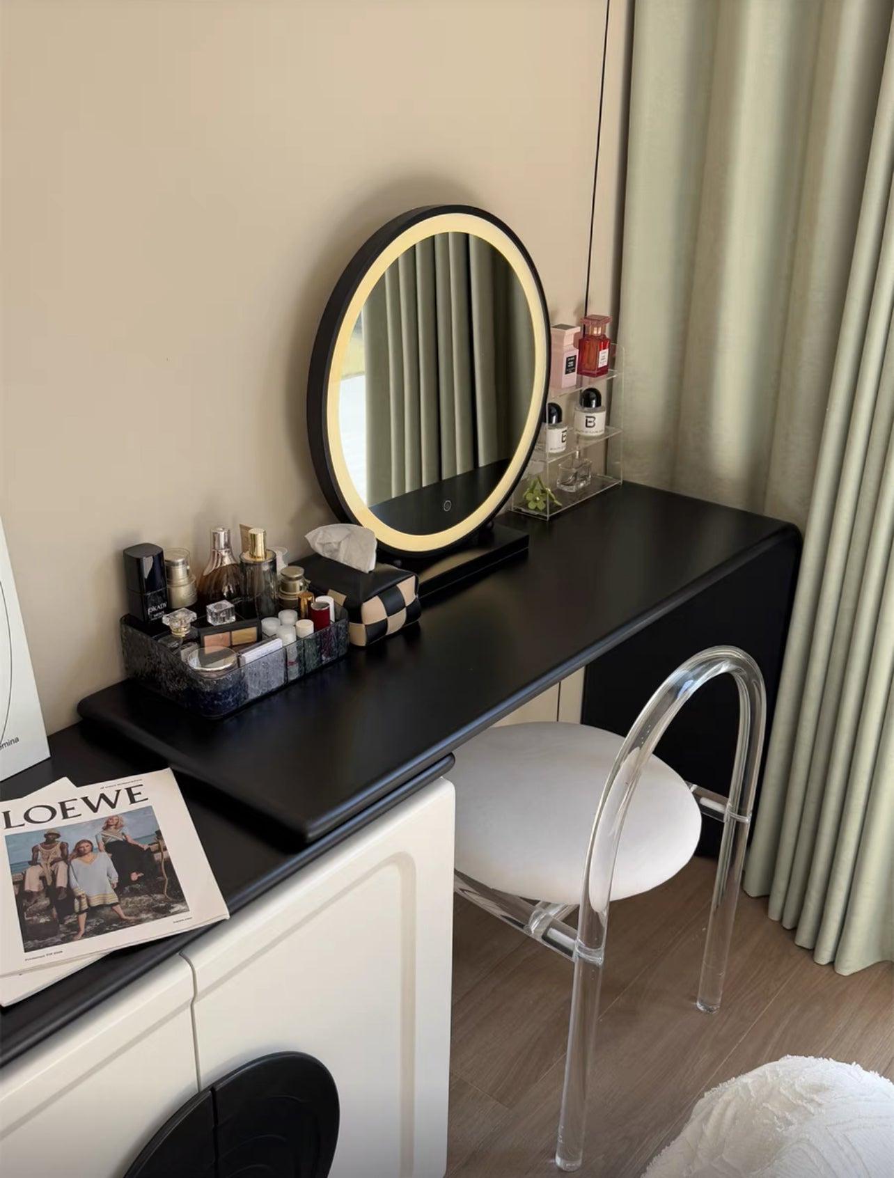 Elevate your space with the Eclipse Harmony Vanity Set, a striking blend of modern elegance and functional sophistication. Featuring a seamless black-and-white contrast, this luxury dressing table boasts a sleek curved extension, a round LED mirror, and spacious storage with artistic circular accents. The minimalist yet bold design is paired with a plush, cloud-like stool or a sculptural designer chair, creating the ultimate statement piece for any contemporary bedroom or dressing area. Crafted with high-quality materials, this modern makeup vanity offers both style and organization, making it a must-have for beauty lovers and interior enthusiasts alike. Shop now for a refined, space-saving solution with premium craftsmanship!