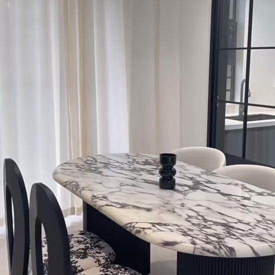 Elevate your dining experience with the Eclipse Marquina Table, a masterpiece crafted from premium Marquina marble. This exclusive table showcases a bold, sophisticated design with striking black and white contrasts, making every meal a luxurious affair. Its unique, organic patterns captivate the eye, while the polished surface reflects light, adding elegance to any dining space.