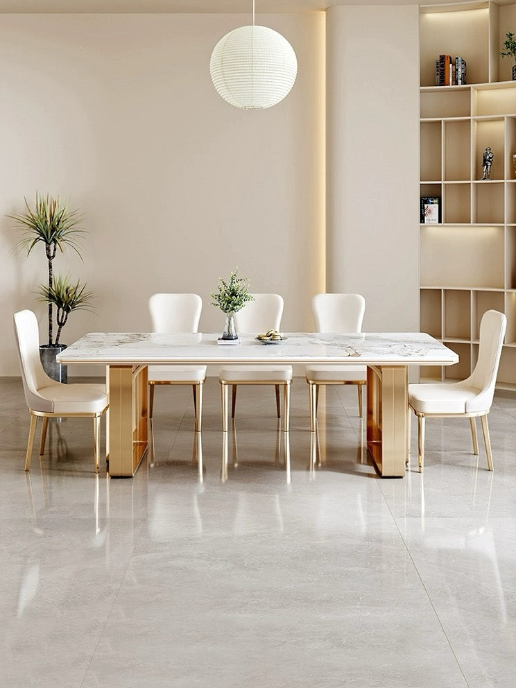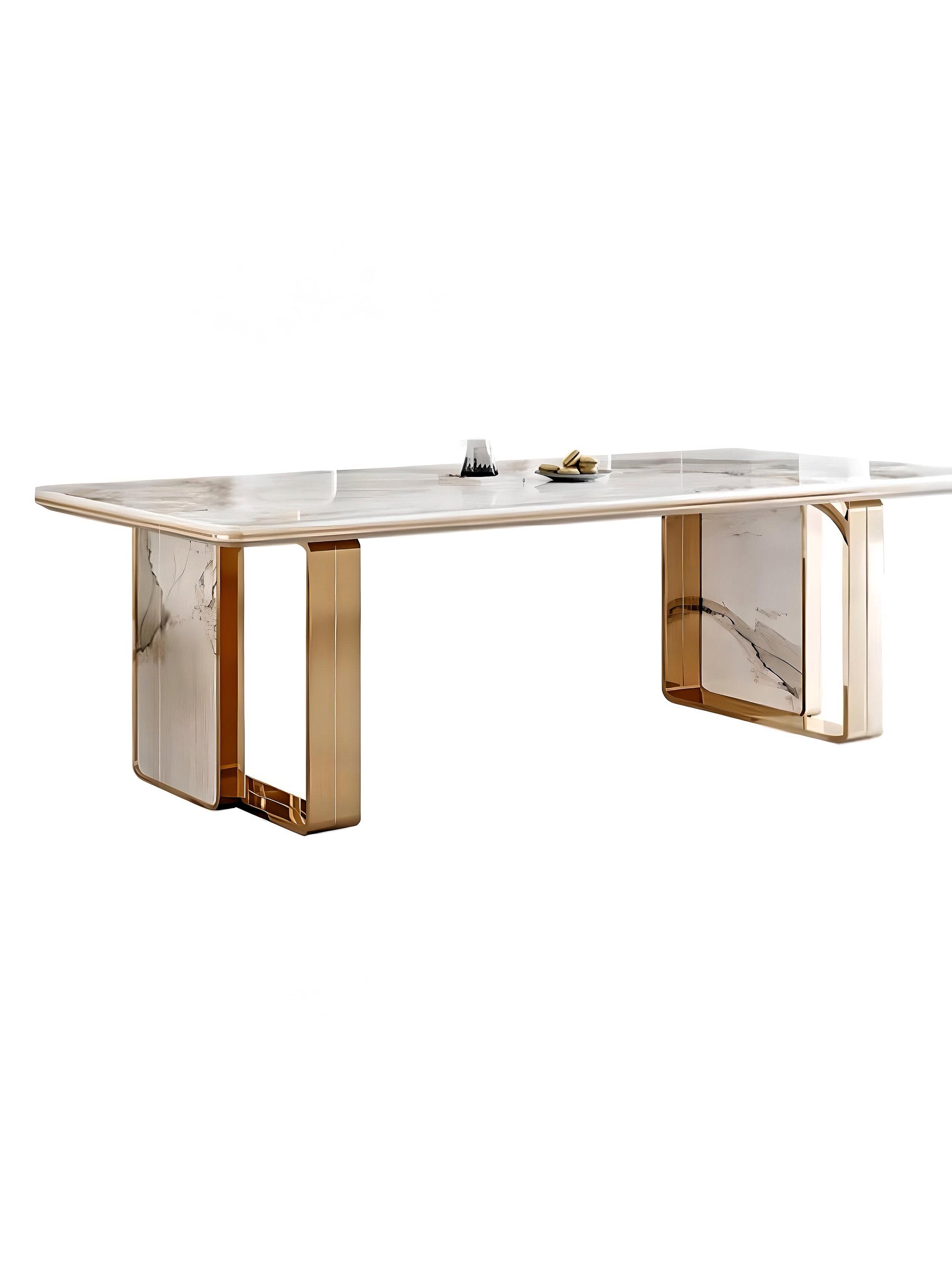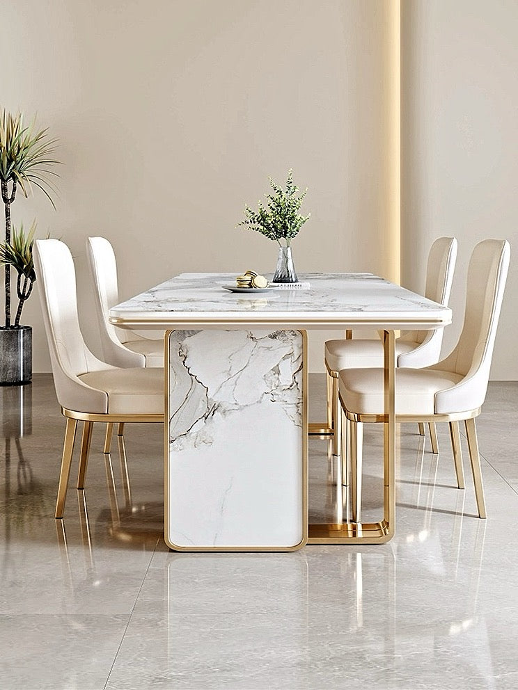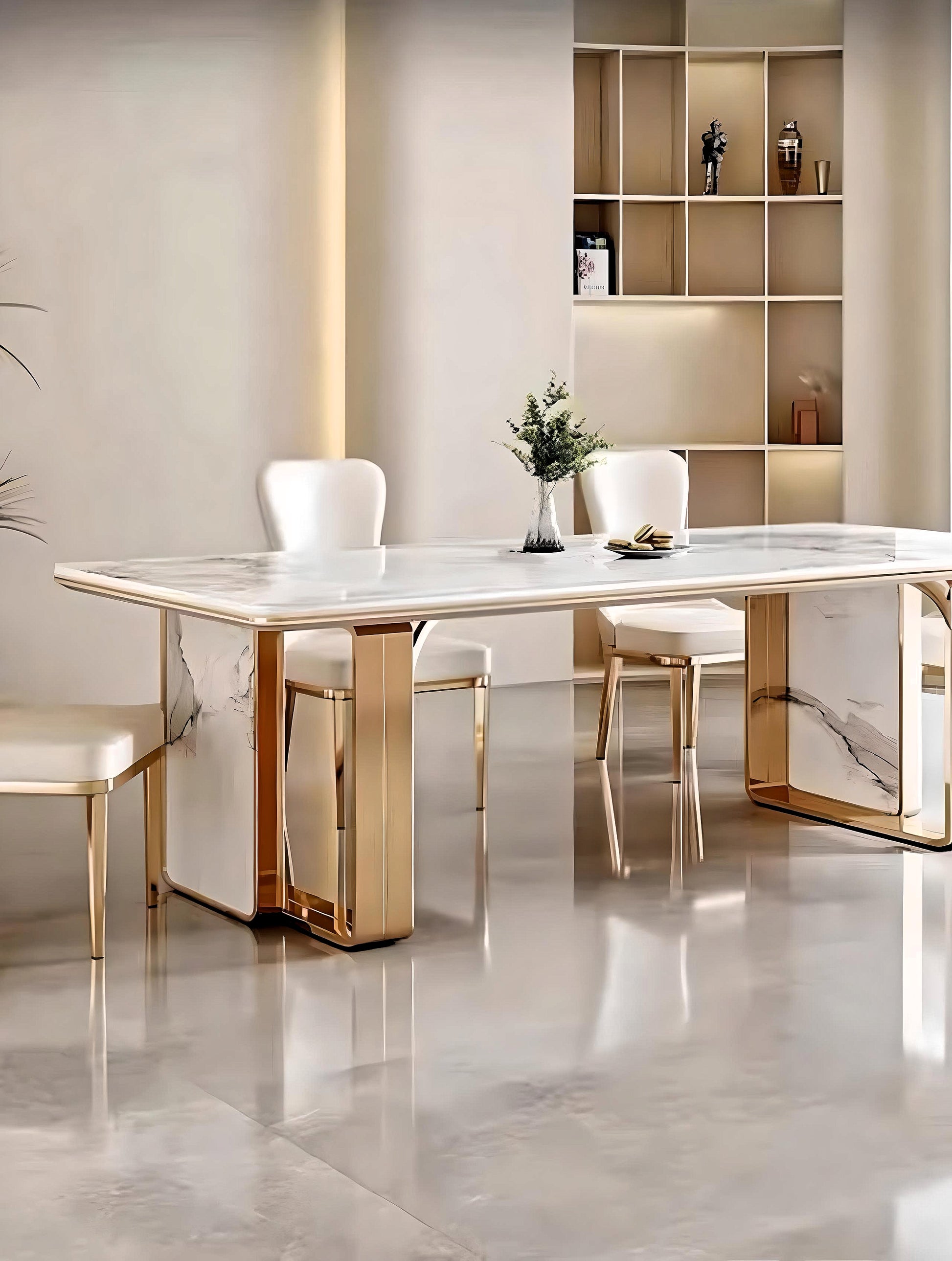 The Elegance Enigma dining table exudes sophistication and modern luxury, making it a perfect centerpiece for any dining space. Its sleek design features a stunning marble tabletop with intricate veining, providing a touch of natural beauty and elegance. The gold-accented base, with its unique geometric shapes, adds a contemporary flair and ensures stability and durability. Available in multiple sizes to suit various room dimensions, this table combines aesthetic appeal with functionality. The matching upholstered chairs offer comfort and style, completing the set and inviting memorable dining experiences. Ideal for both formal gatherings and casual meals, the Elegance Enigma dining table effortlessly elevates the ambiance of any dining room.