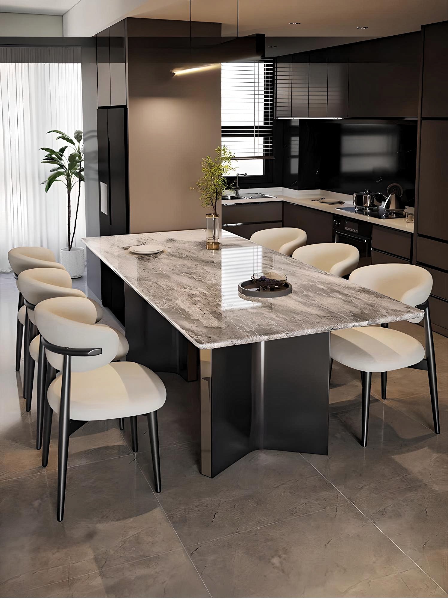 The Eleganza Marble-Top Kitchen Island – the epitome of modern sophistication for your culinary space. Crafted with precision, this stunning centerpiece features a luxurious marble surface that promises durability and style. Surrounded by plush white chairs, it invites family and friends to gather in comfort while adding an air of elegance to your kitchen. The sleek stainless steel base ensures stability and adds a contemporary edge that complements any decor.