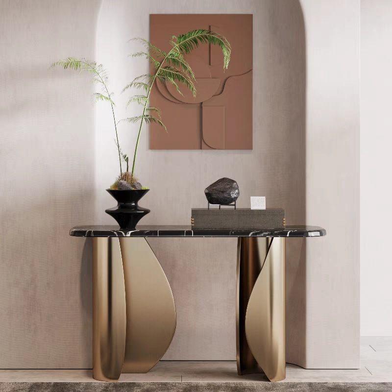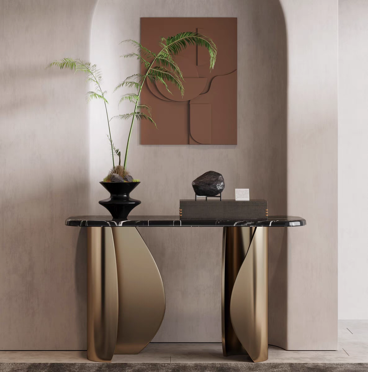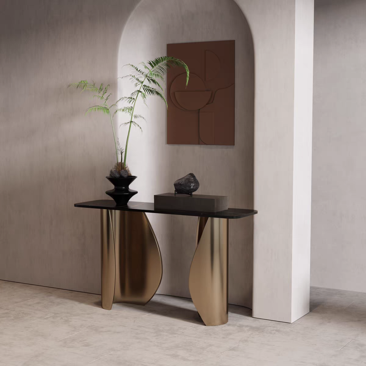 Elevate your interior with the Elysian Luxe Console Table, a masterpiece of contemporary sophistication. Designed with a striking black marble top and sculptural gold-finished metal legs, this statement piece exudes modern luxury. The fluid, wave-like base design creates a stunning focal point, making it perfect for entryways, living rooms, or hallways. Crafted with premium materials, this console table combines durability with timeless elegance. Whether styled with décor accents or left minimalist, the Elysian Luxe Console Table transforms any space with effortless grandeur. Ideal for those seeking a bold yet refined aesthetic.
