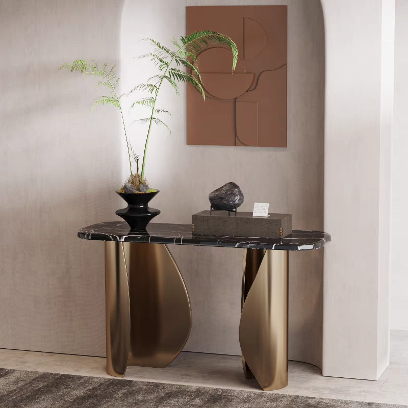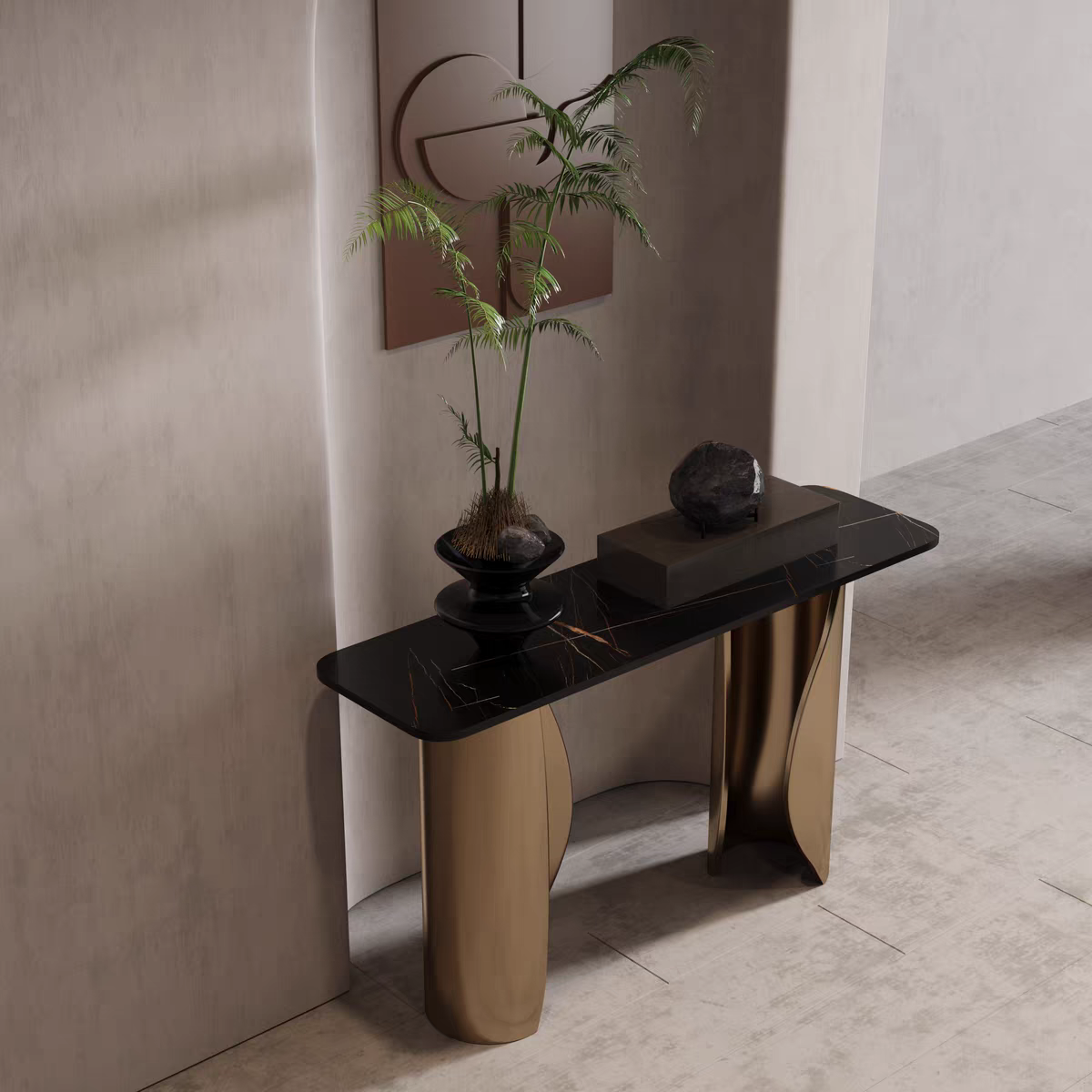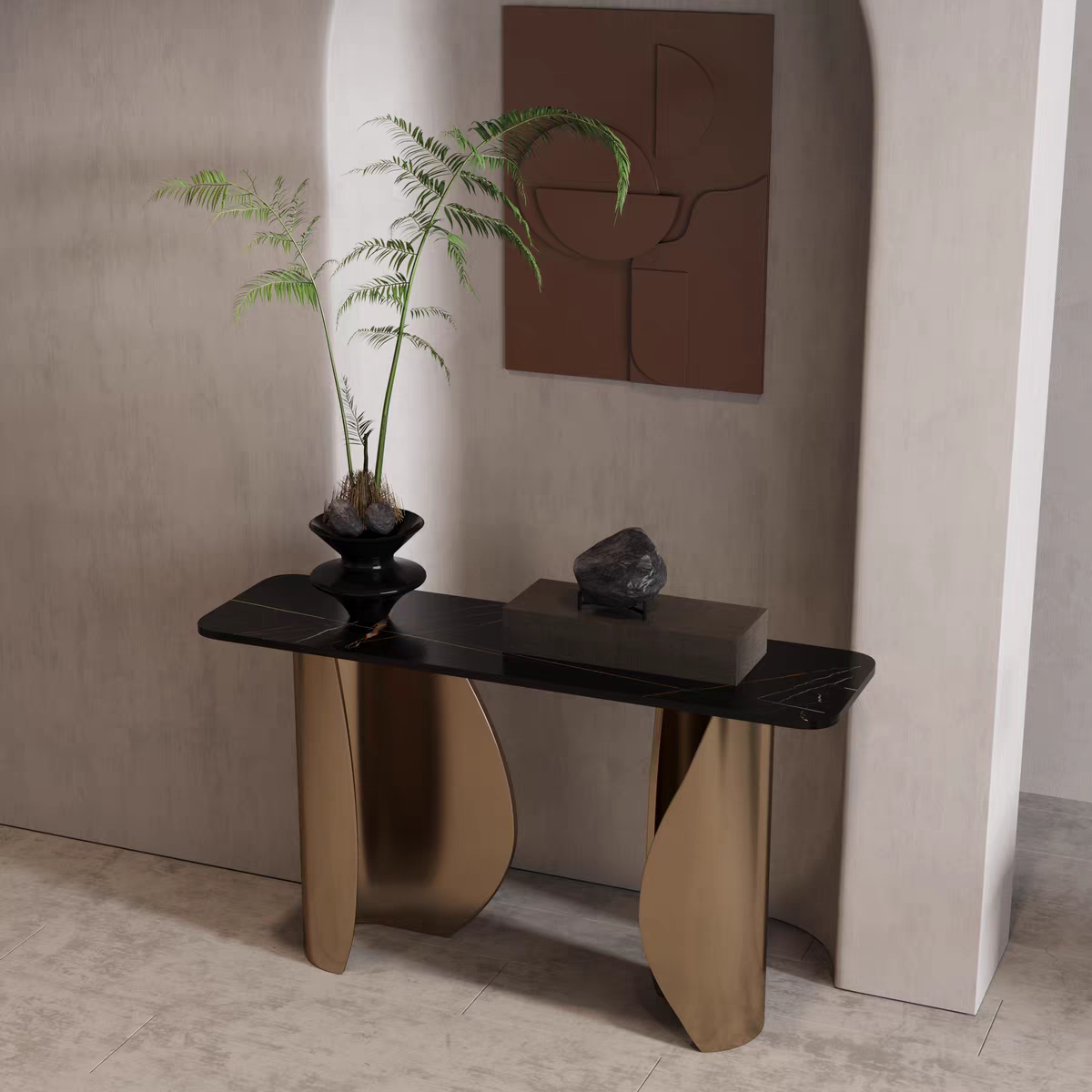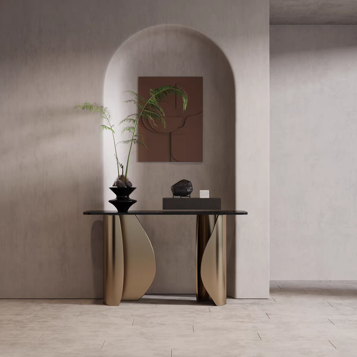 Elevate your interior with the Elysian Luxe Console Table, a masterpiece of contemporary sophistication. Designed with a striking black marble top and sculptural gold-finished metal legs, this statement piece exudes modern luxury. The fluid, wave-like base design creates a stunning focal point, making it perfect for entryways, living rooms, or hallways. Crafted with premium materials, this console table combines durability with timeless elegance. Whether styled with décor accents or left minimalist, the Elysian Luxe Console Table transforms any space with effortless grandeur. Ideal for those seeking a bold yet refined aesthetic.