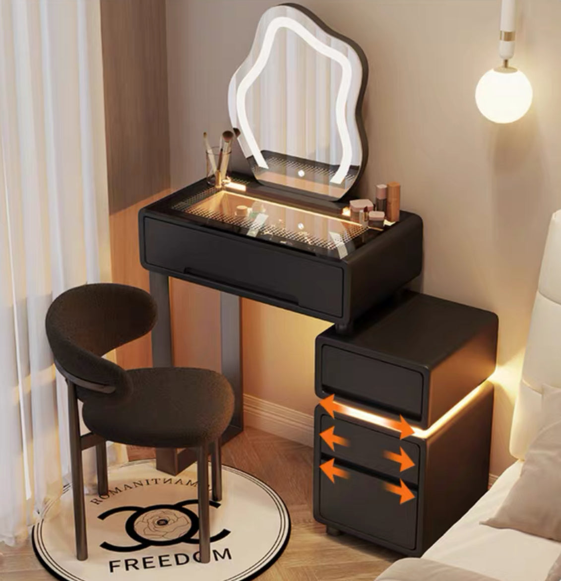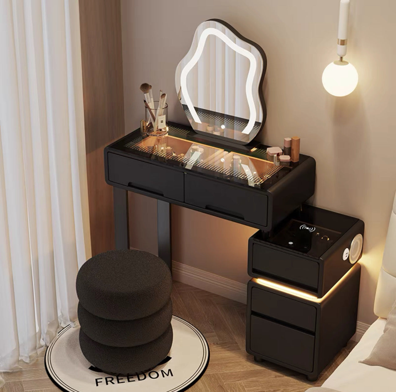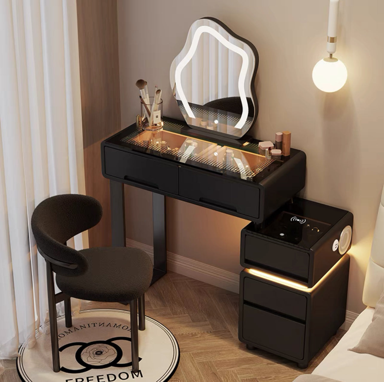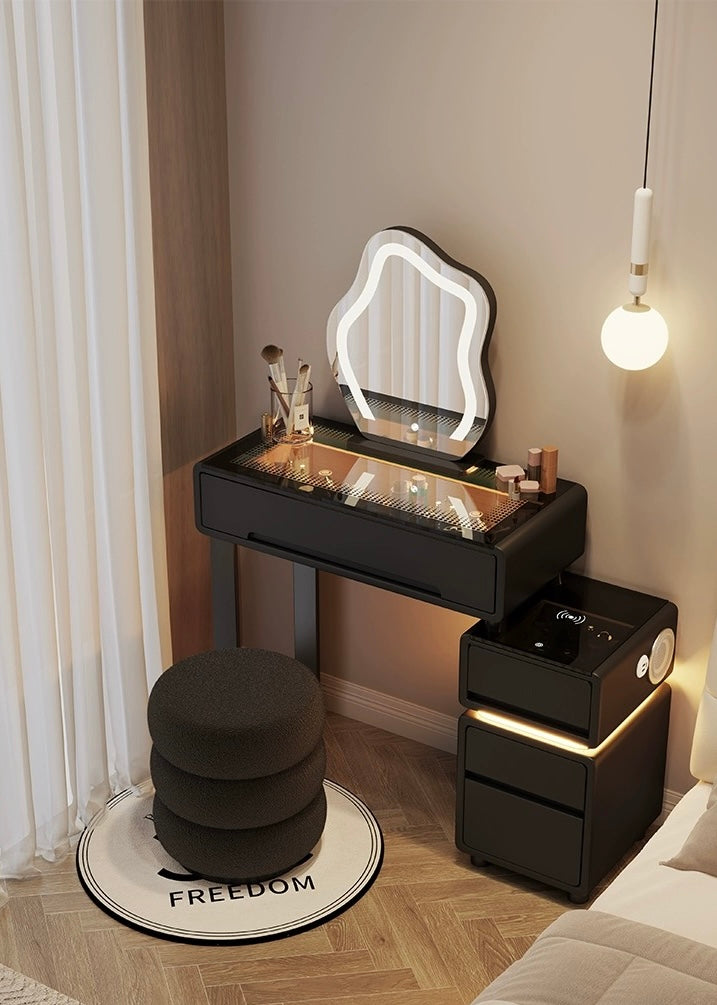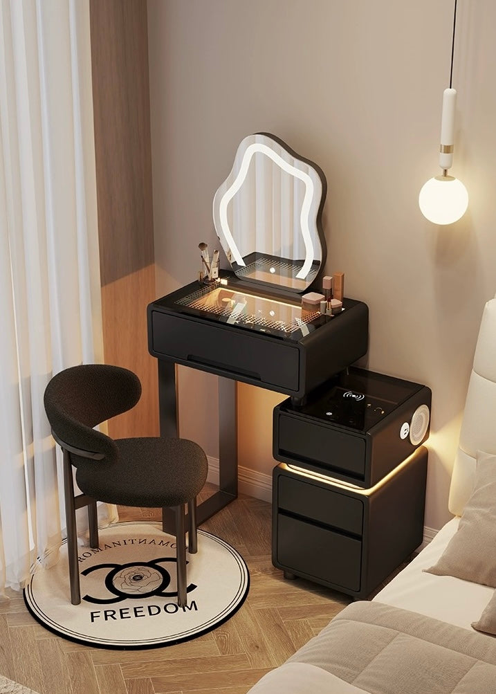 Complementing the vanity is a cozy, ergonomically designed chair that ensures comfort during your beauty routine. Additionally, the vanity set includes a side storage unit with built-in lighting, featuring a wireless charging pad and built-in speakers. These convenient features allow you to charge your devices effortlessly and enjoy your favorite music or podcasts while getting ready. This chic and stylish vanity setup is ideal for those who value both aesthetics and practicality in their daily grooming space.