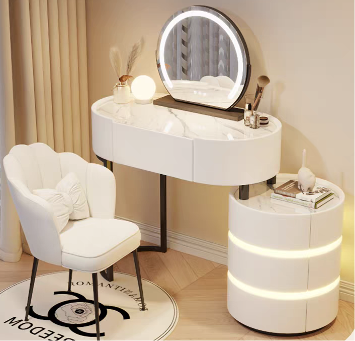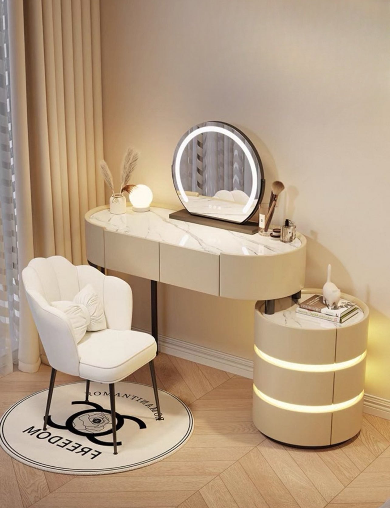 Crafted for those who appreciate the finer things in life, the Lumina Luxe Vanity Suite is more than just a piece of furniture; it’s a statement of style. With its radiant circular mirror that bathes you in a halo of light, every moment you spend before it ensures you start your day with confidence. The sleek white finish of the spacious drawers promises to blend seamlessly into your chic decor, while offering ample space to house all your beauty essentials.