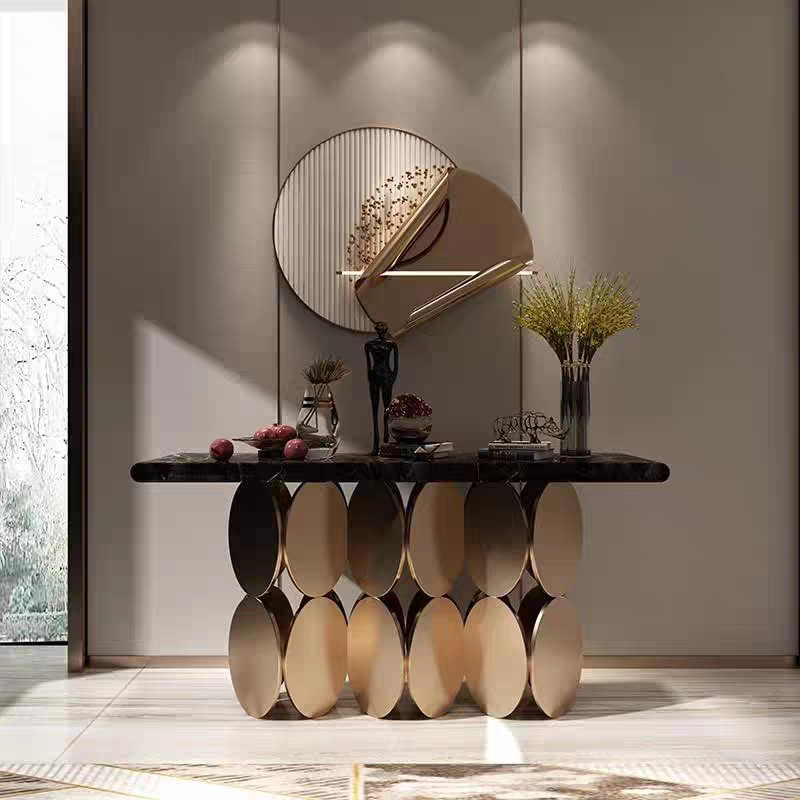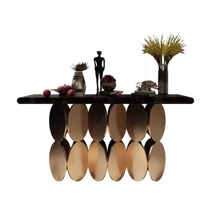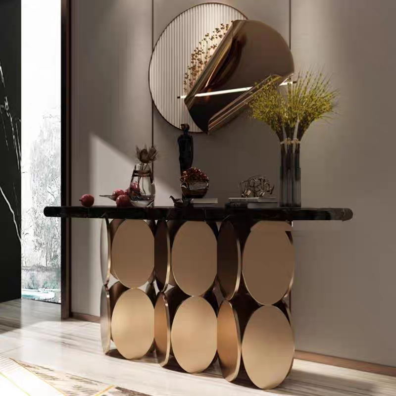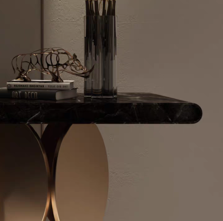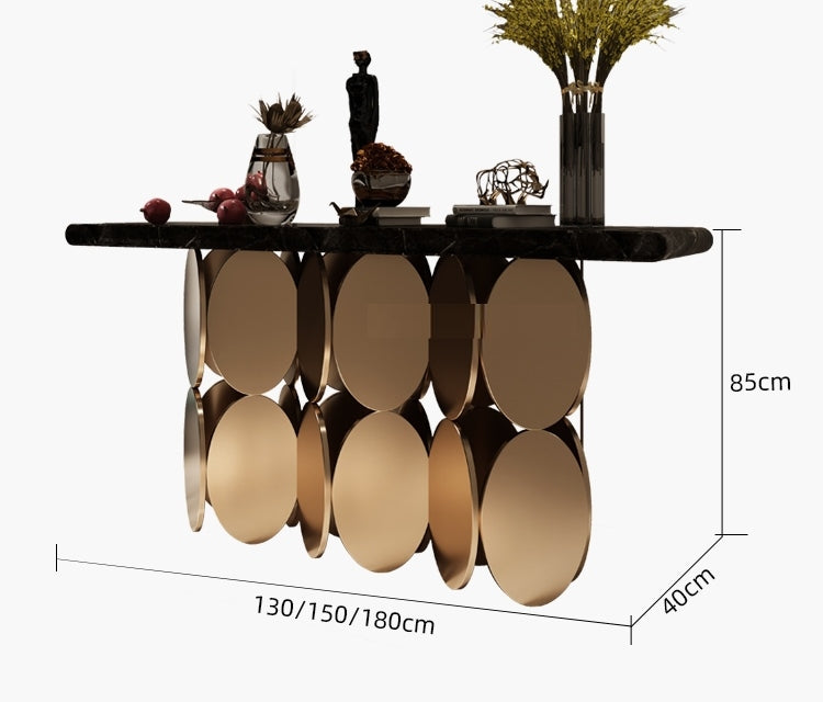 Upgrade your living space with the Luxe Eclipse Console Table, a statement piece that blends luxury with artistic design. Featuring a sleek black marble top and an eye-catching golden circular base, this console table exudes modern sophistication. Its floating illusion design adds a touch of elegance, making it perfect for entryways, hallways, or luxury interiors. Available in multiple sizes (130cm, 150cm, and 180cm) to fit various spaces, this console table is a stunning combination of functionality and contemporary charm. Elevate your home décor with this designer masterpiece today!