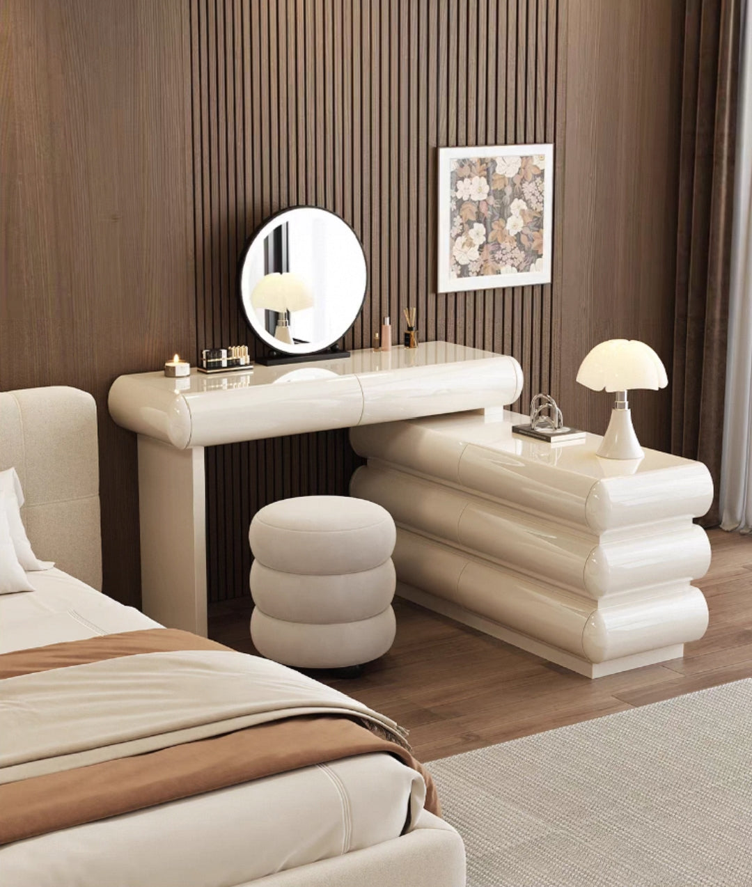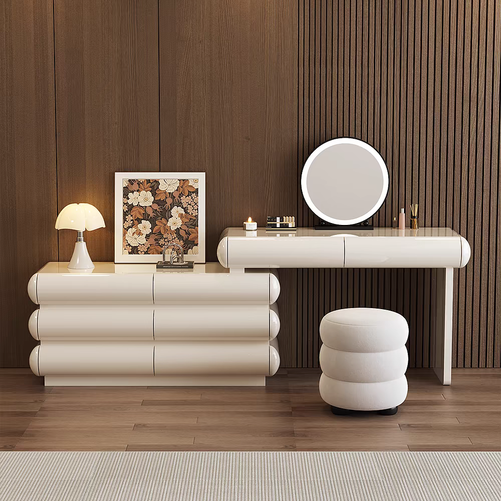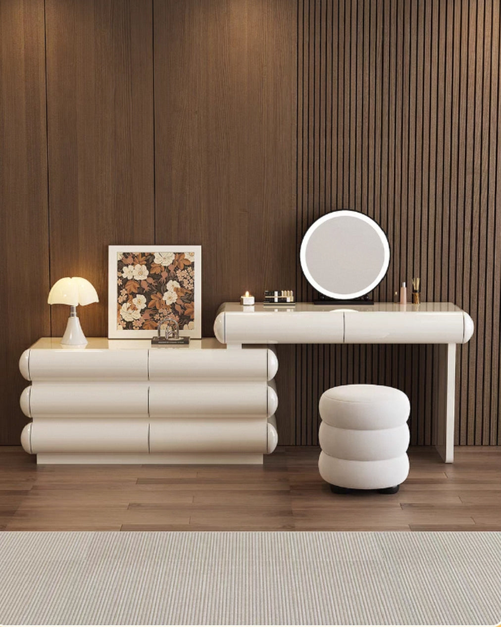 Elevate your daily routine with the Luxe Serenity Vanity Set, a perfect blend of elegance and functionality. Featuring a sleek, high-gloss finish with soft, rounded edges, this modern dressing table set offers ample storage with its distinctive, cylindrical drawer design. The spacious tabletop is available in multiple sizes (80/100/120 cm) to fit your space perfectly. Complete with a touch-sensor LED mirror and a plush, cloud-like stool, this vanity creates a calming, luxurious atmosphere for your beauty rituals. Ideal for contemporary bedrooms, this stylish set is more than furniture—it's your secret corner for timeless beauty. Shop now for a chic, clutter-free space!