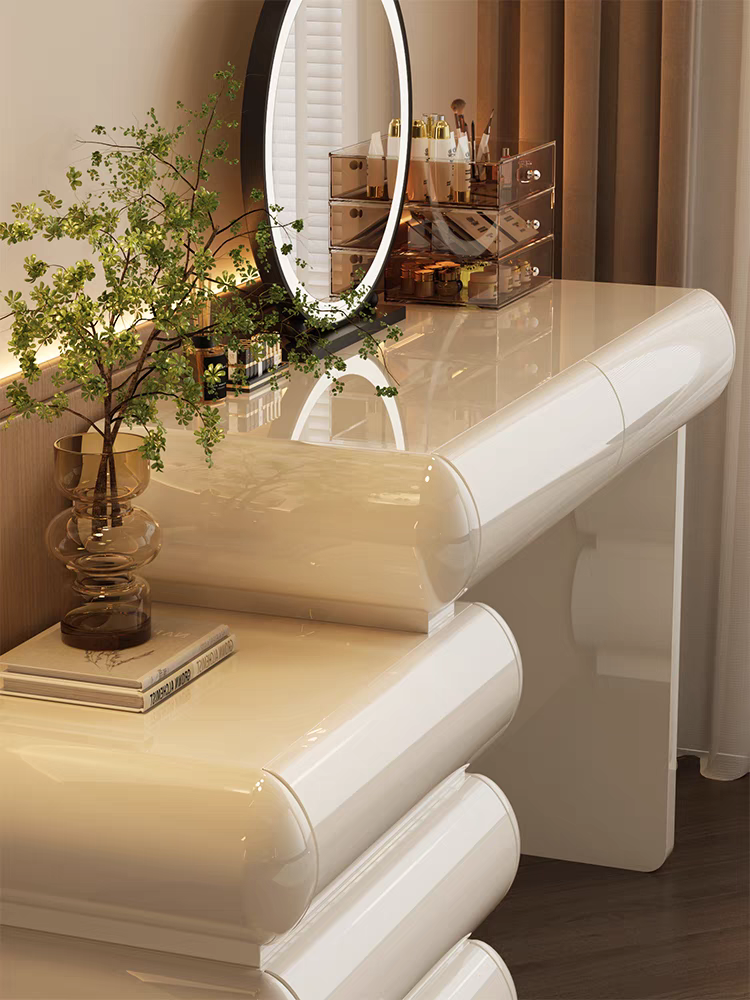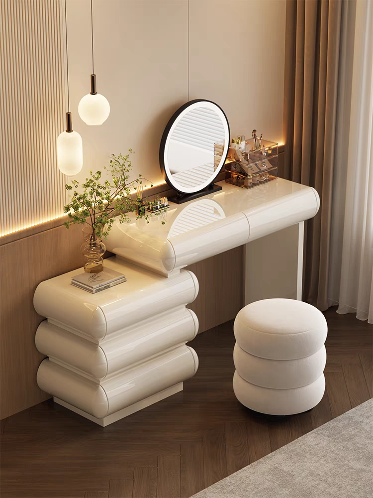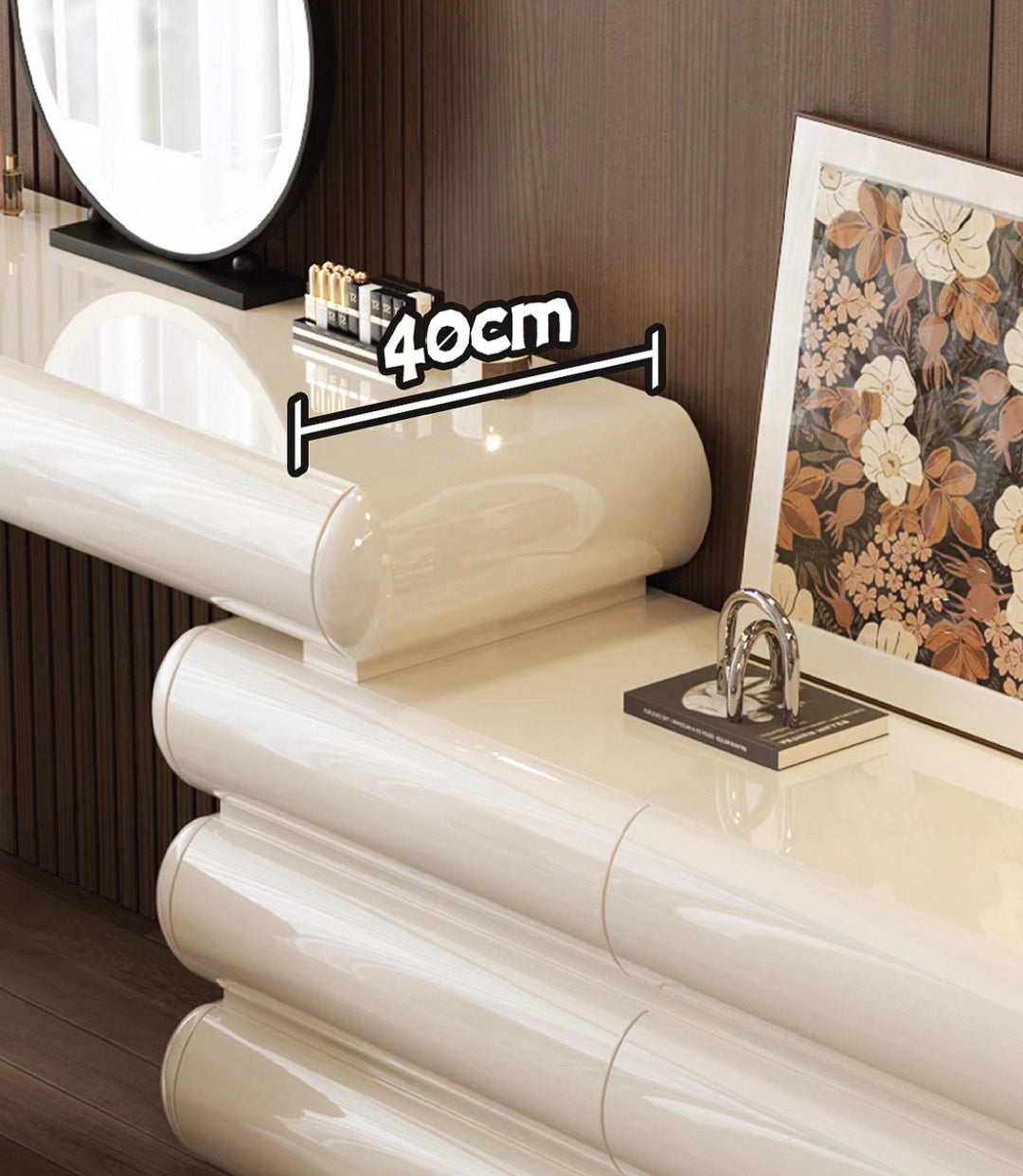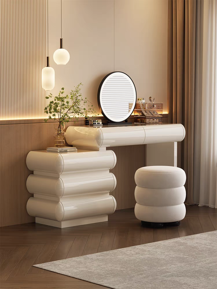 Elevate your daily routine with the Luxe Serenity Vanity Set, a perfect blend of elegance and functionality. Featuring a sleek, high-gloss finish with soft, rounded edges, this modern dressing table set offers ample storage with its distinctive, cylindrical drawer design. The spacious tabletop is available in multiple sizes (80/100/120 cm) to fit your space perfectly. Complete with a touch-sensor LED mirror and a plush, cloud-like stool, this vanity creates a calming, luxurious atmosphere for your beauty rituals. Ideal for contemporary bedrooms, this stylish set is more than furniture—it's your secret corner for timeless beauty. Shop now for a chic, clutter-free space!