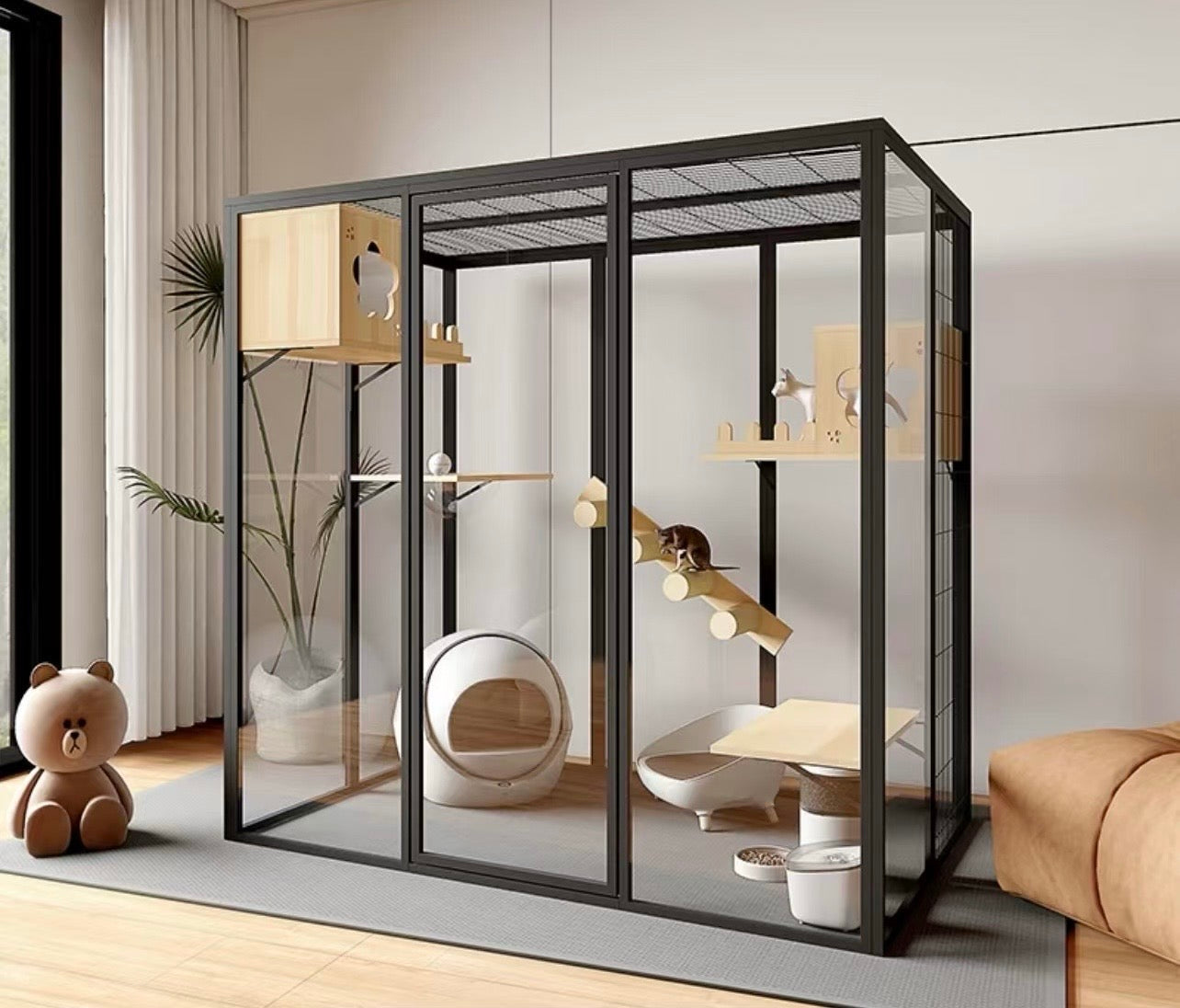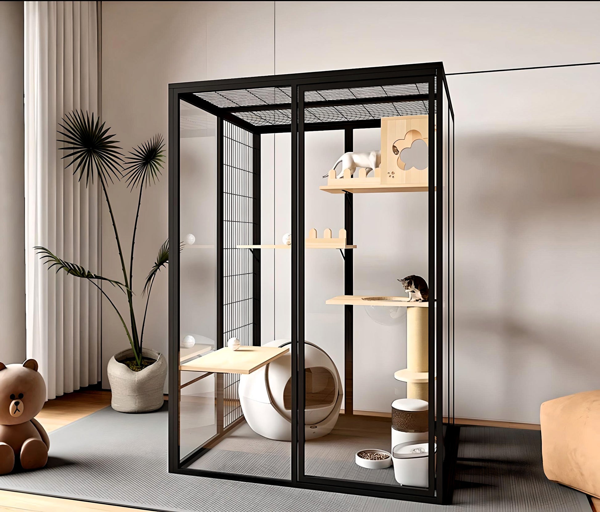 Give your feline friend a luxurious playground with the LuxeCat Haven, an elegantly designed cat enclosure that combines modern aesthetics with functional space for endless feline fun. This stylish cat condo features multiple levels, scratching posts, cozy nooks, and natural wood finishes, creating an interactive and safe environment. The sturdy metal frame and transparent panels provide a secure yet open space, allowing cats to explore and climb while adding a sophisticated touch to any home decor. Perfect for pet owners who prioritize safety, comfort, and style, LuxeCat Haven is a premium addition that your cats will adore and your guests will admire.