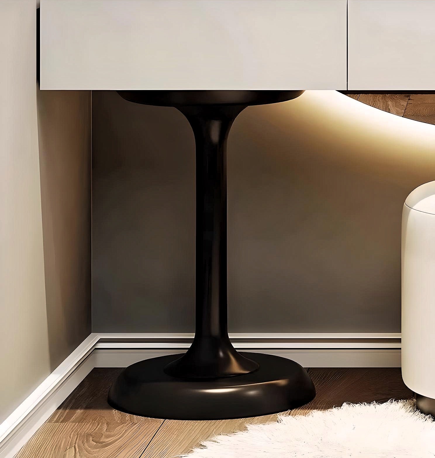 Accompanying the vanity is a plush, cushioned stool designed for comfort and style, complete with a subtle leather strap for an added touch of luxury.