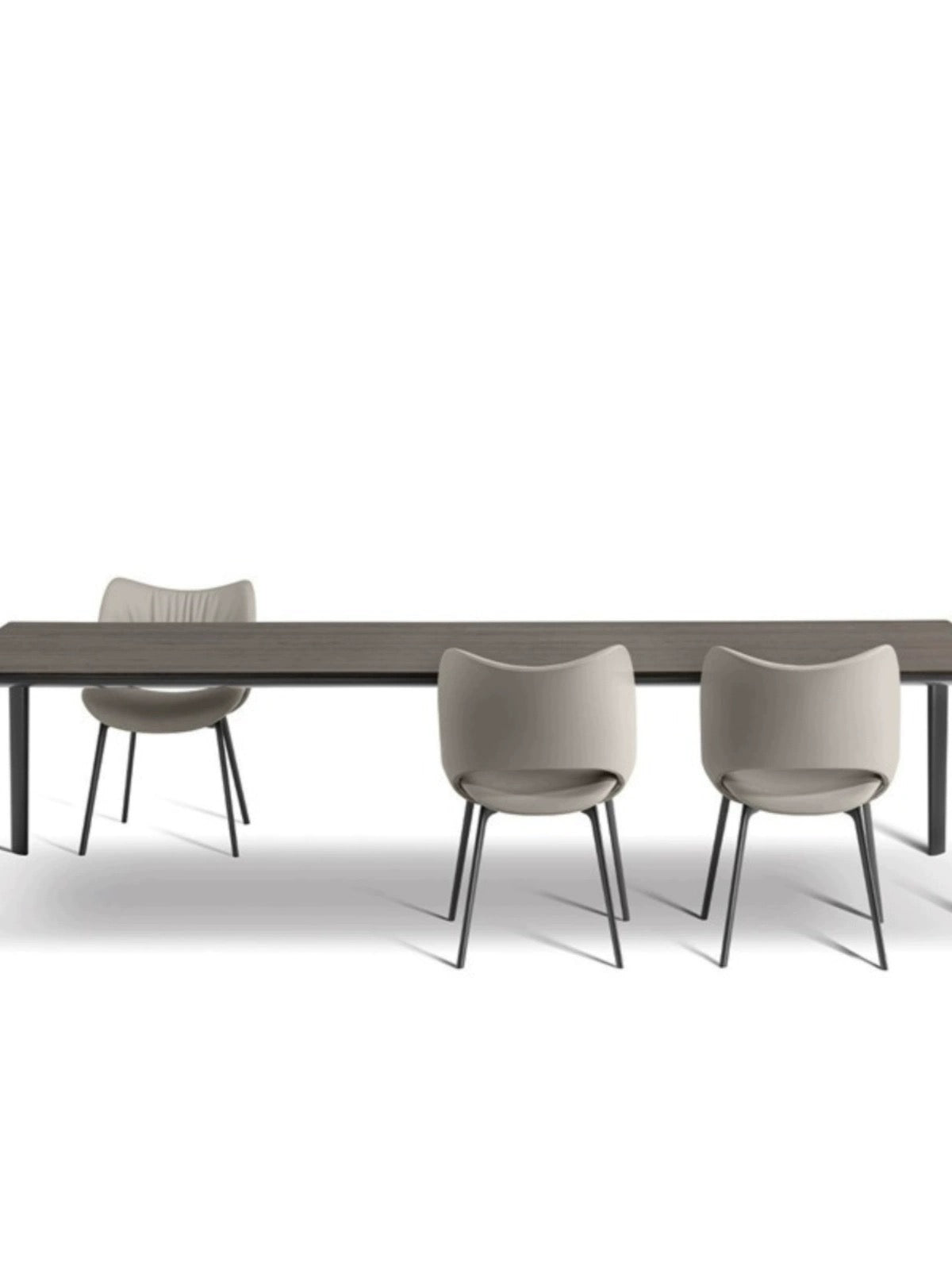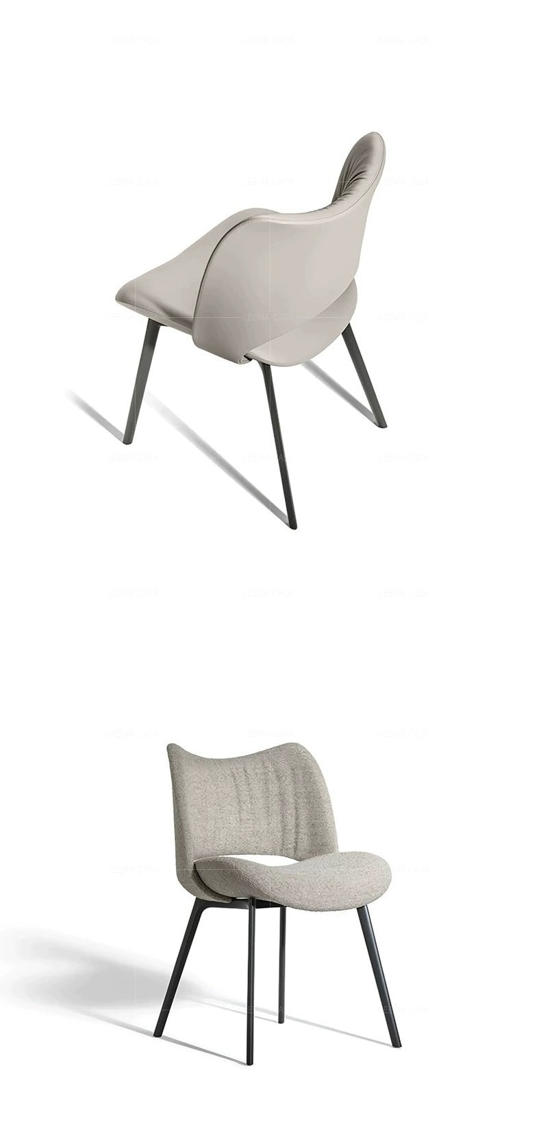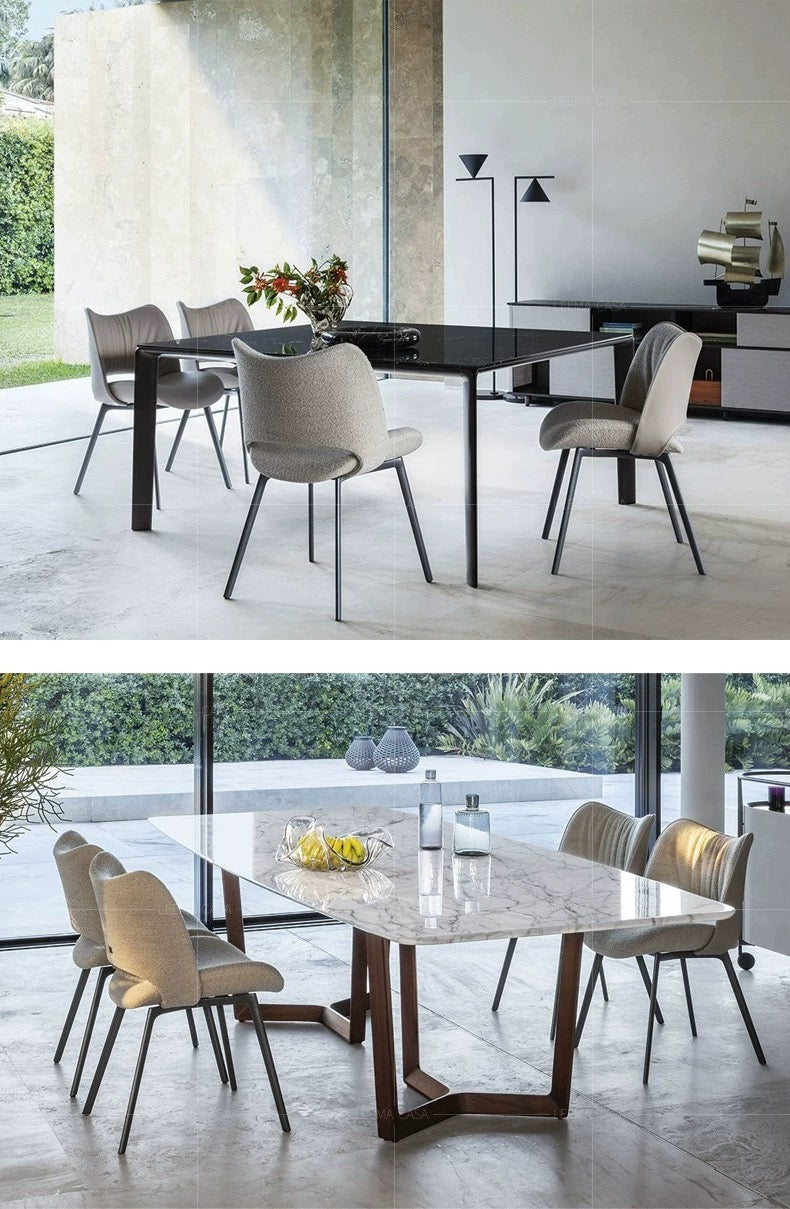 The Chic Embrace dining chair offers a perfect blend of modern design and luxurious comfort. Its sculpted backrest, with gently gathered detailing, wraps around to form a snug, supportive seat that invites you to relax and enjoy your meals. Upholstered in a soft, durable fabric or sleek leather, the chair is available in sophisticated shades such as neutral taupe, elegant gray, and contemporary beige. The sturdy metal legs provide stability and a touch of industrial chic, making the Chic Embrace an ideal addition to both contemporary and classic dining spaces. Whether used in a dining room, kitchen, or office, this chair brings a refined elegance and superior comfort to any setting.