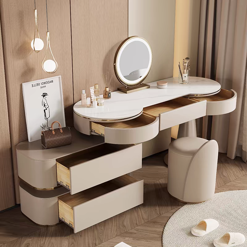 Elevate your daily beauty routine with The Luxe Elegance Vanity Set, a perfect blend of modern sophistication and functionality. This stunning vanity features a sleek, curved design with a glossy beige finish, complemented by gold accents for a touch of luxury. The set includes a round LED mirror, providing perfect lighting for flawless makeup application, and multiple spacious drawers to neatly organize all your beauty essentials. The matching cushioned stool offers comfort and style, making this vanity the centerpiece of any bedroom or dressing area. Ideal for modern homes, The Luxe Elegance Vanity Set is where beauty meets elegance.