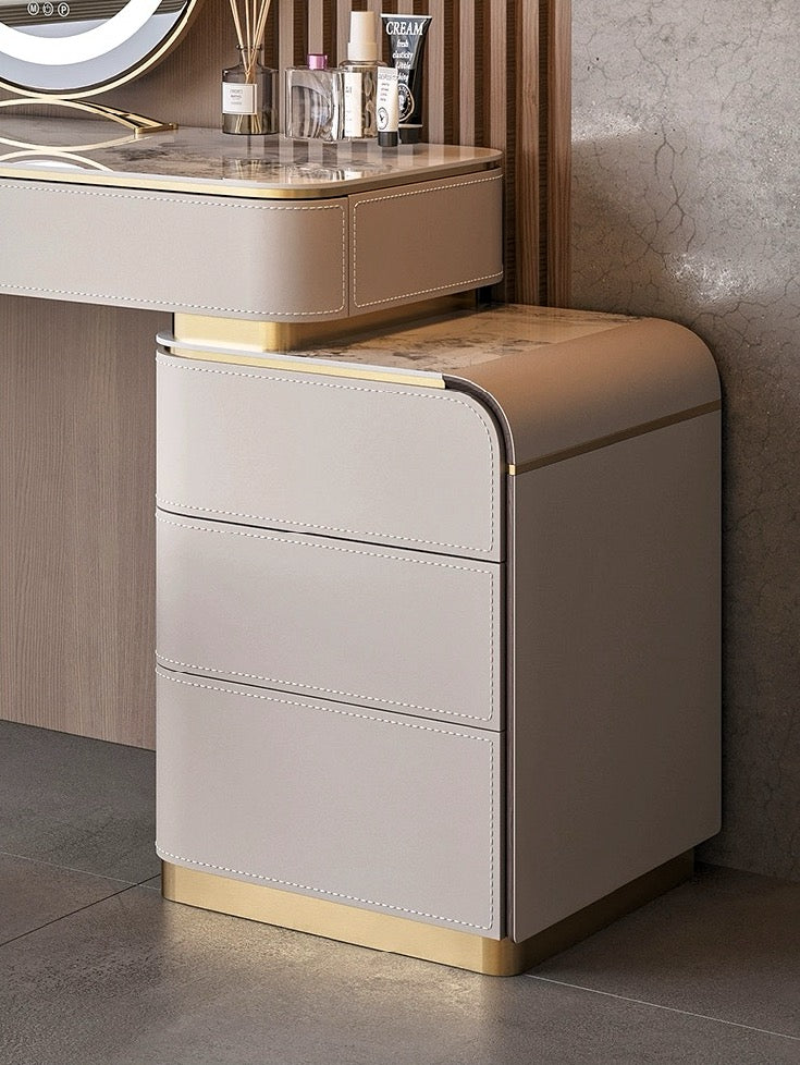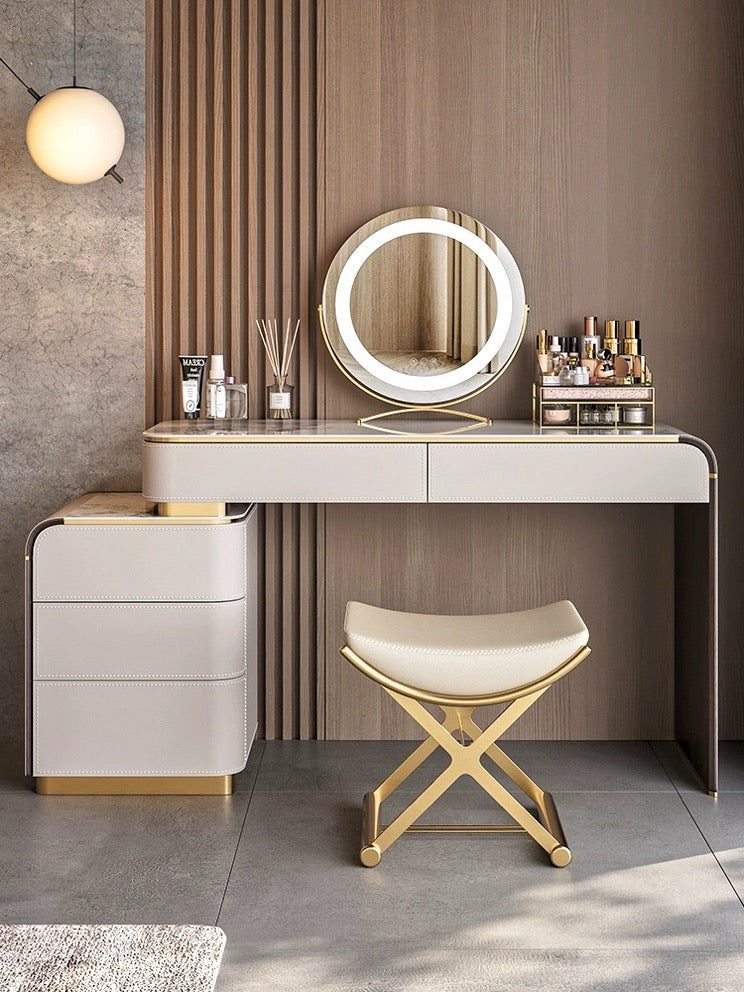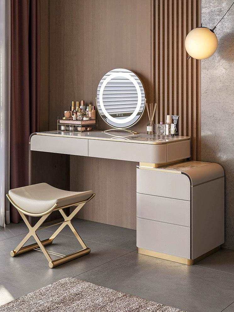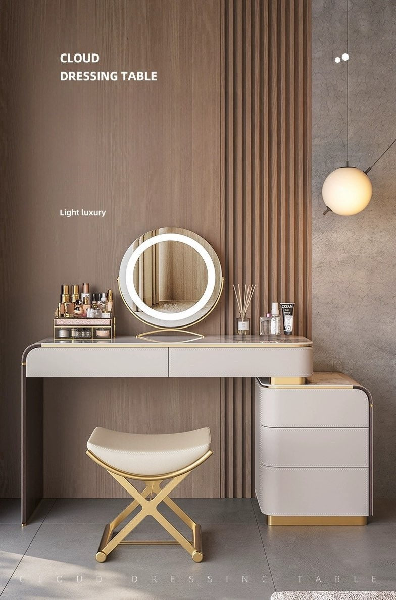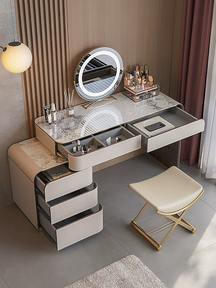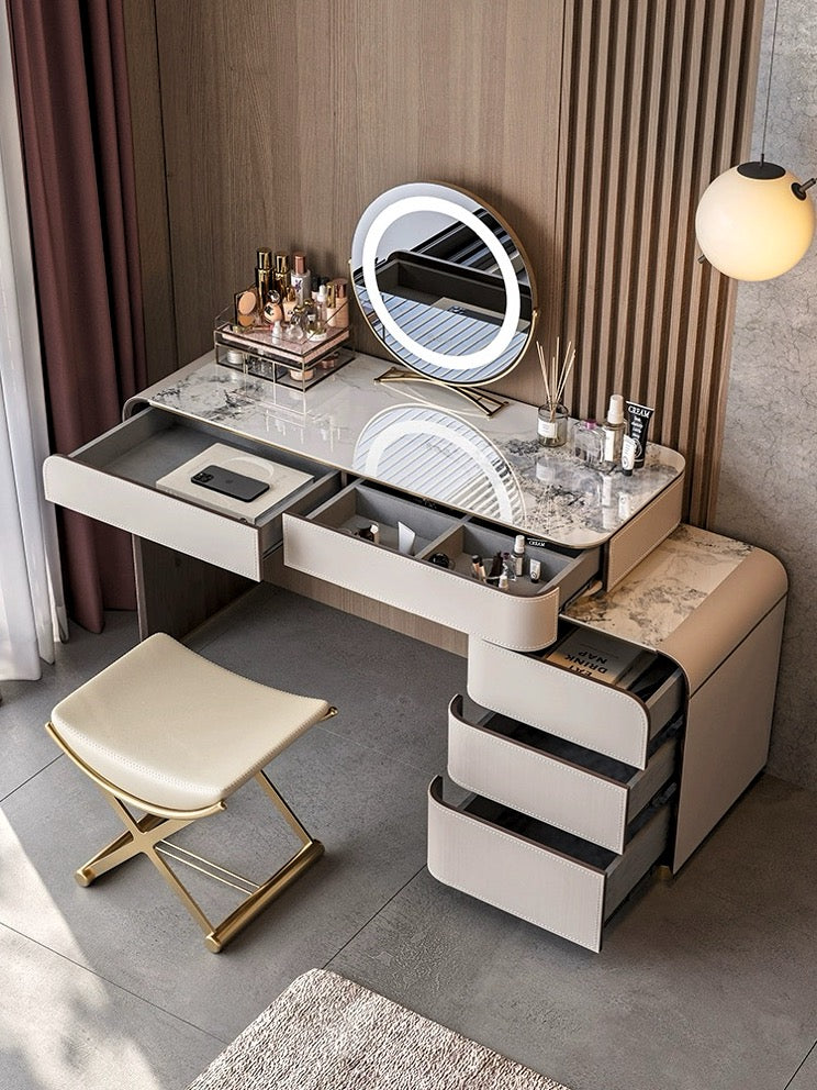 The Luxe Reverie Vanity features spacious, soft-closing drawers lined with high-quality fabric, ensuring your beauty essentials are organized in style. The centerpiece of this vanity is the round LED mirror, which provides perfect illumination for flawless makeup application.