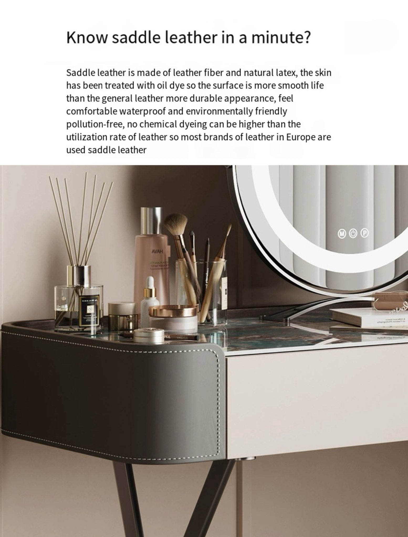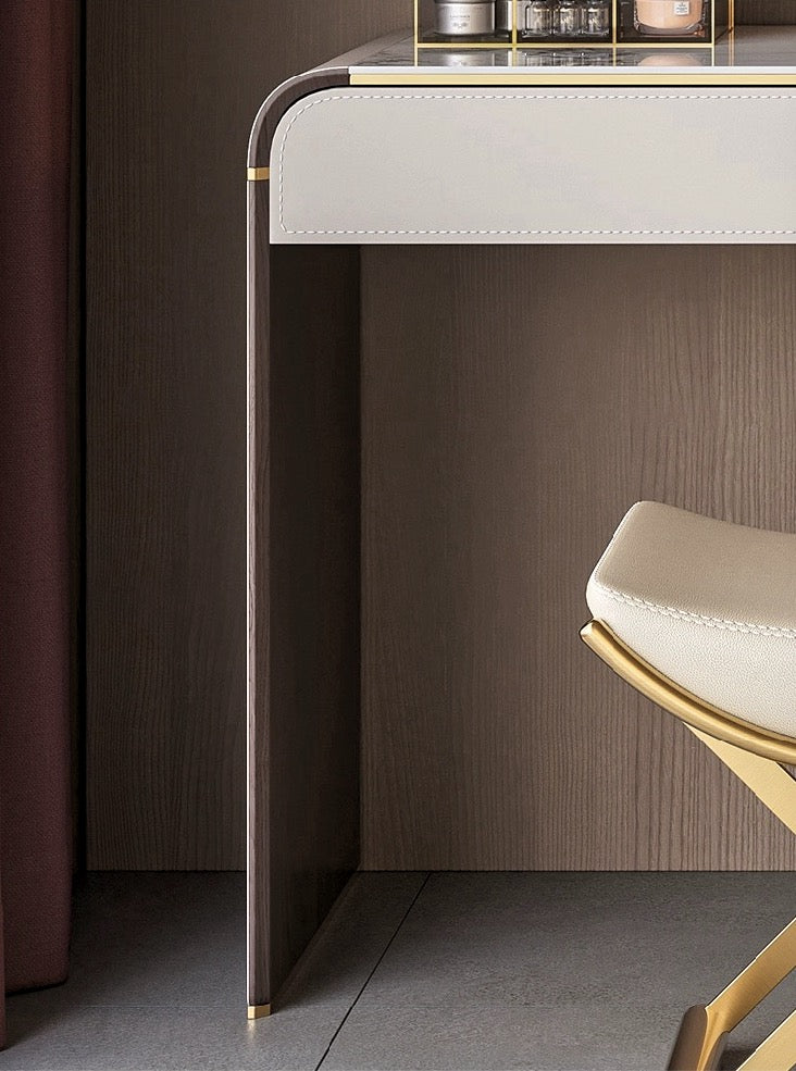 Indulge in the epitome of luxury and sophistication with the Luxe Reverie Vanity. Crafted from the finest saddle leather and premium materials, this exquisite dressing table exudes elegance and functionality. The marble-finished top, paired with sleek gold accents, creates a stunning focal point in any dressing room or bedroom.