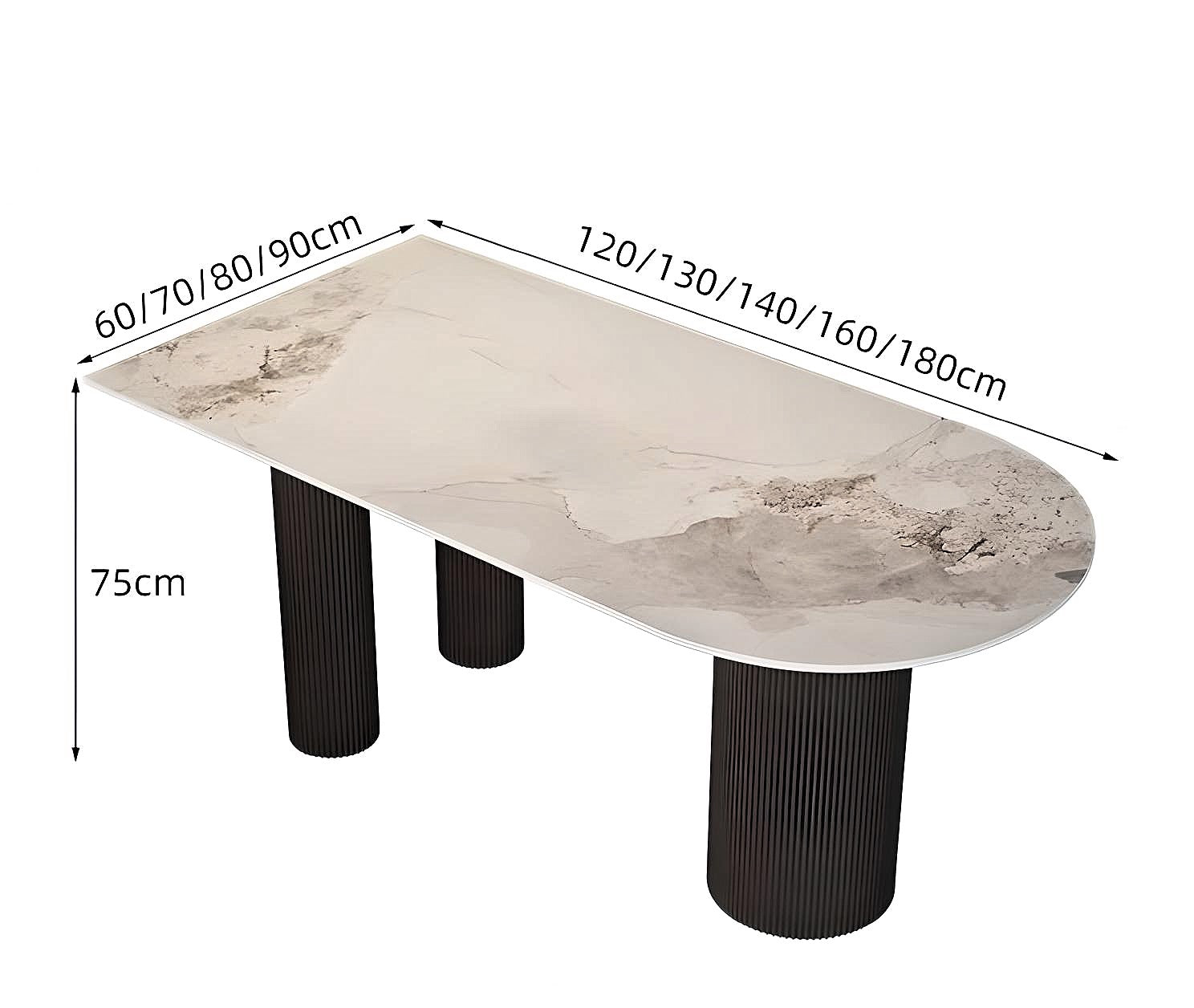 The tabletop's smooth, polished surface exudes a sense of refined elegance, making it the perfect centerpiece for both intimate family dinners and lavish gatherings. Its sturdy base, composed of two cylindrical, fluted pillars, not only ensures stability but also adds a touch of architectural flair.