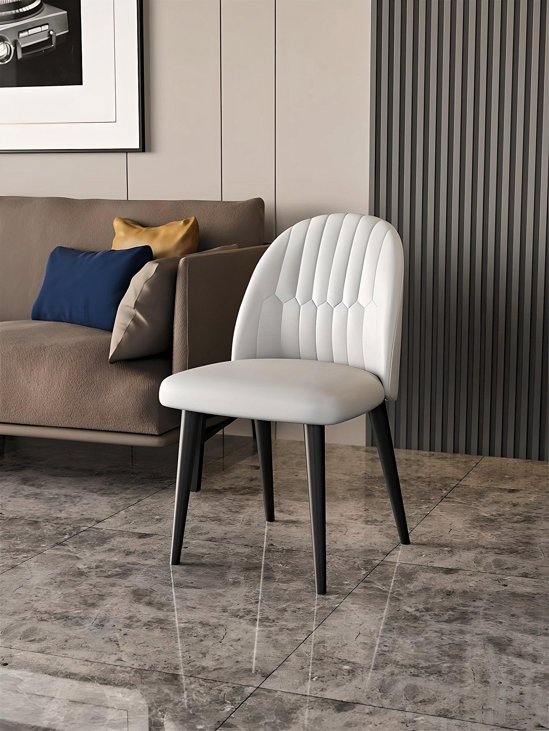 Complemented by a set of four ergonomically designed chairs with plush, white upholstery and tapered legs, the Serenity Elegance Dining Table offers a harmonious blend of comfort and style. The chairs' sleek curves and minimalist design perfectly echo the table's modern aesthetic, creating a cohesive and inviting dining area.