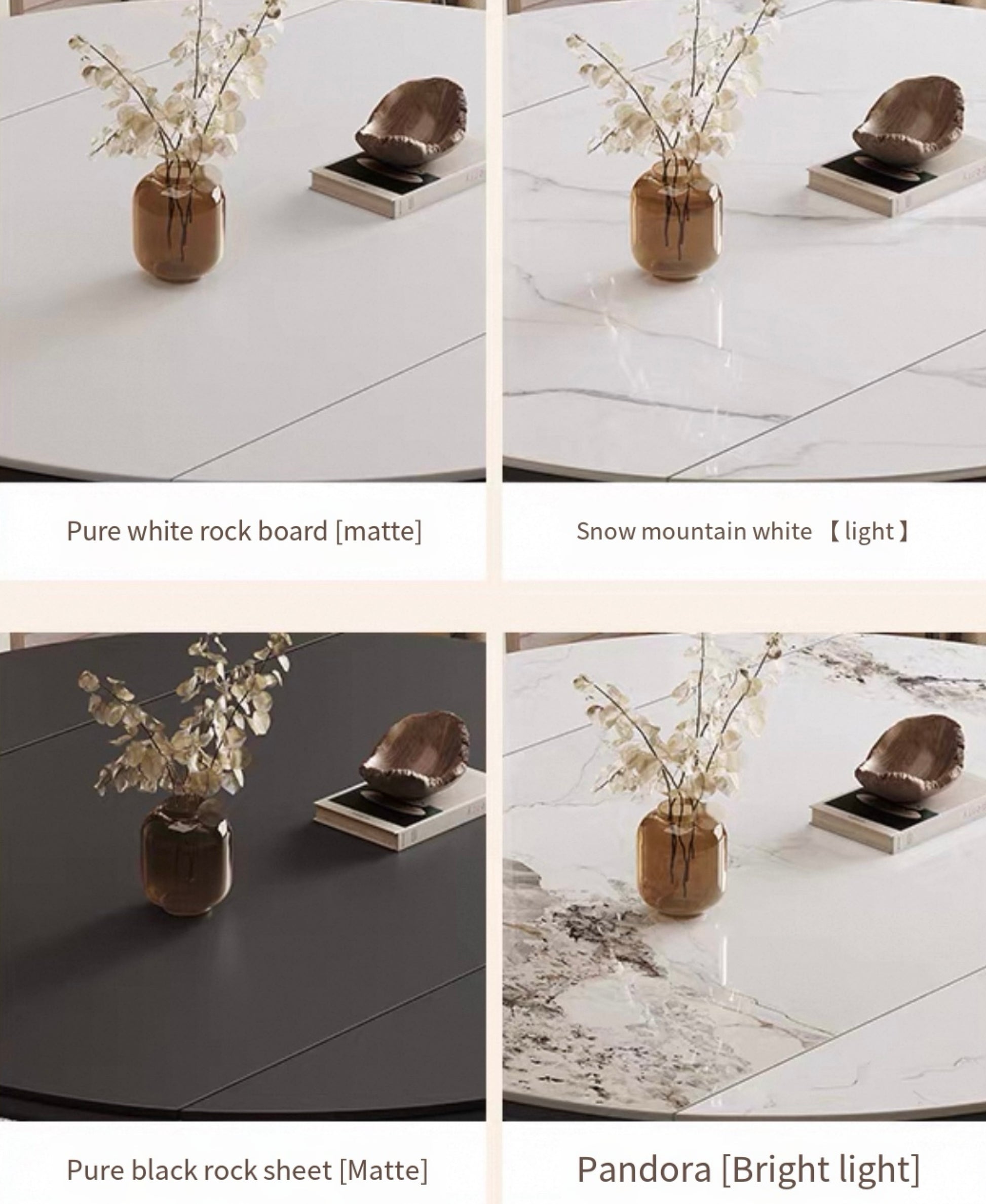 Crafted with S-grade rubberwood base and reinforced carbon steel, it’s built for strength and long-term durability. Choose from a variety of elegant sintered stone finishes including Matte White, Glossy White, Matte Black, and Glossy Pandora Marble—each matched with sleek, cushioned chairs for maximum comfort.